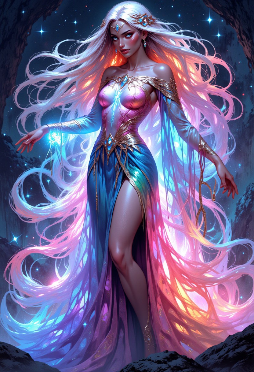 "A radiant goddess stands in a realm of celestial wonder, her presence both mesmerizing and otherworldly. Her flowing hair cascades in vibrant streaks of rainbow light, shimmering and shifting like a living aurora. Her lips glisten like sculpted crystal, catching the light and refracting it into dazzling prisms. Her eyes, translucent and reflective like flawless glass, hold an ethereal depth, as if they contain entire galaxies within. Her form is adorned in an iridescent gown that seems woven from starlight and mist, radiating a soft, otherworldly glow. She exudes an aura of serene power, a perfect harmony of beauty and divinity. Describe the interplay of light and color that surrounds her, emphasizing her transcendent presence and the surreal elegance of her celestial features."