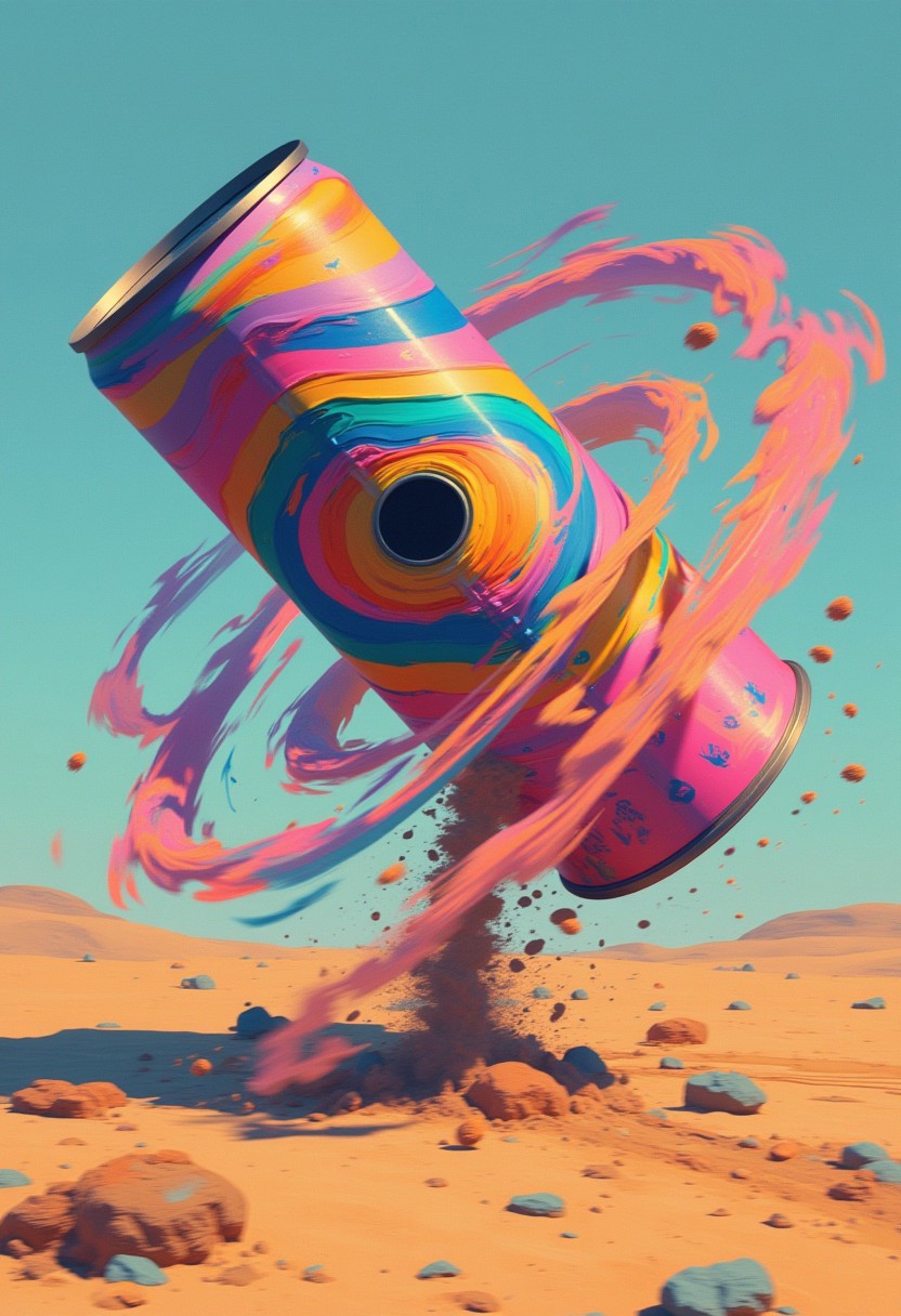 psycho_4rt, This is an artheon-style painting that merges the surreal with the abstract. The scene depicts a cyberpunk Matte colorful can, spinning, tipped, speed, gust, tornado winds, sand, motion blur, photo real