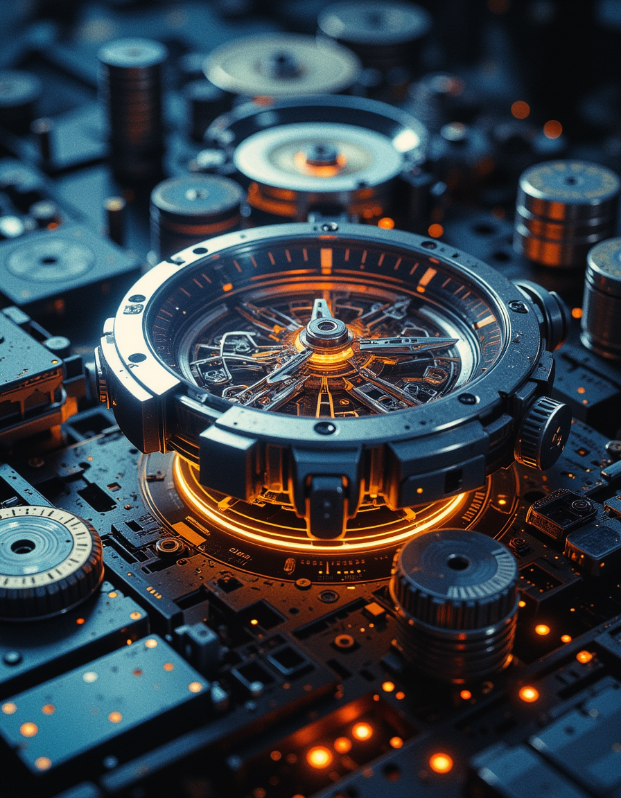 Electronic wristwatch parts located on (different layers, assembly diagram). Volumetric visualization. Beautiful gradient designations. Futuristic..,.. (Depth of field), low saturation,detail. mythp0rt Stylish, charismatic. The background is minimalist, a gradient of shadowy blue tones, amplifying the ethereal and futuristic ambiance of the scene. The overall composition feels cinematic, blending high fashion with a science fiction aesthetic. . Exquisite cyberpunk. . (depth of field) mythp0rt, nigiex.