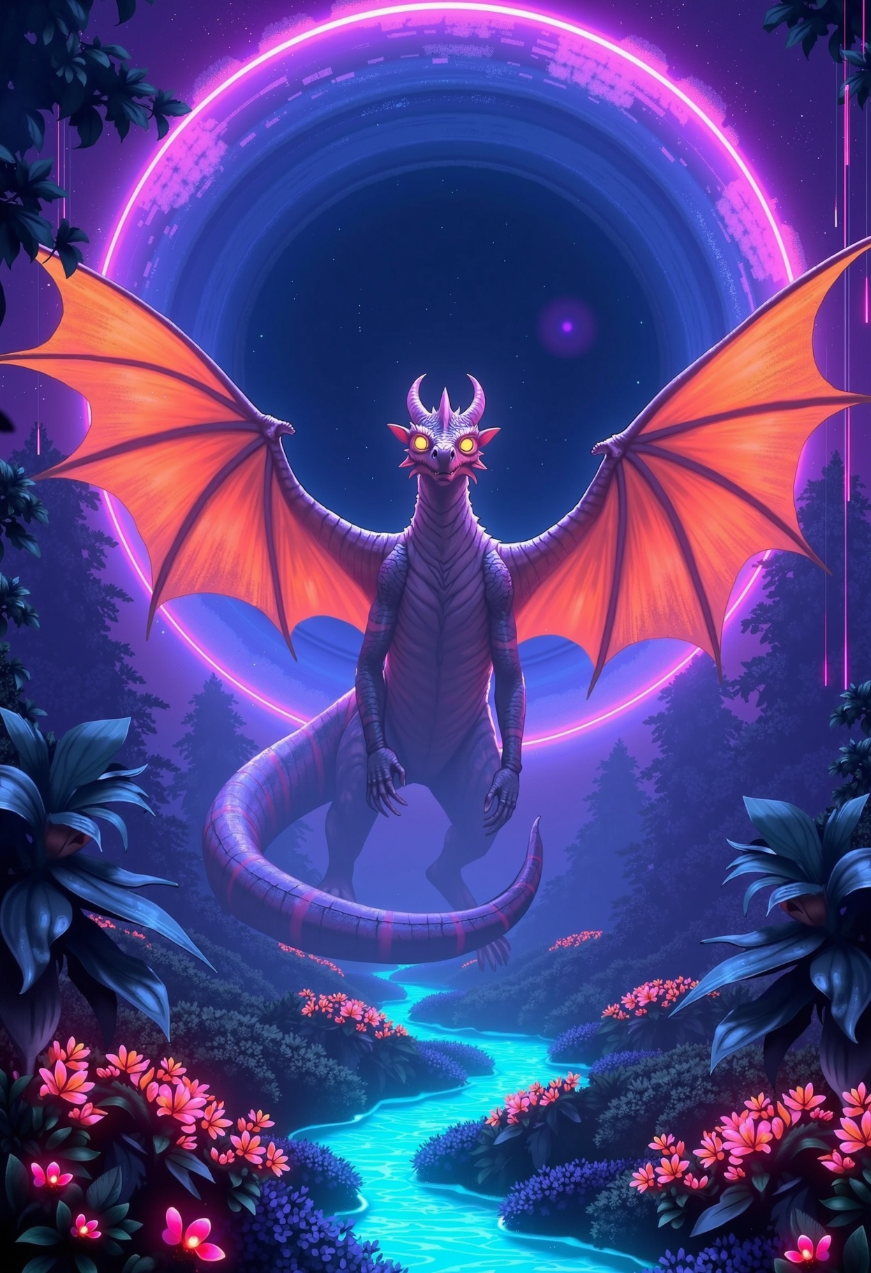 A nightmare dragon emerging through the event horizon of a black hole. The dragon's slender eyes glow like molten gold, and its massive wings are stretched wide, radiating an ethereal neon glow. Below, a lush, enchanted forest pulsates with bioluminescent plants and glowing streams. The scene is illuminated by a soft, magical aurora, blending fantasy and futuristic elements. Hyper-detailed, dramatic lighting, with a focus on vivid colors and intricate textures which showcases the alien world. jc4rmes, <lora:JCarmesStyle:0.6>