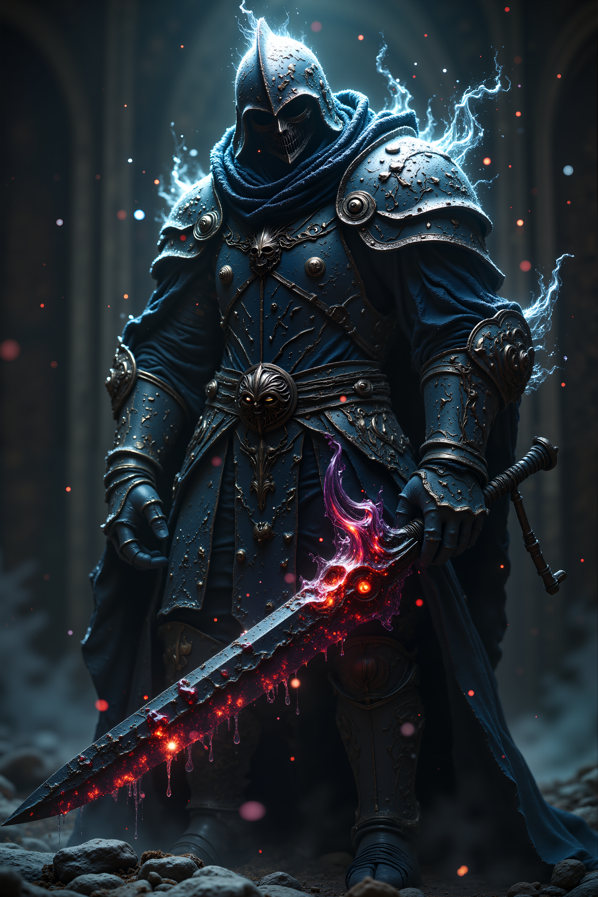 A cursed knight whose armor has partially fused with his flesh after centuries of undeath. Frost covers his ancient platemail while souls of his victims swirl within his helmet. His rusted sword drips with dark magic.Fantastic lighting. Detailed shadows.intricate details, vivid colors, hyper-detailed, ultra-sharp<lora:FluxMythR3alisticF>