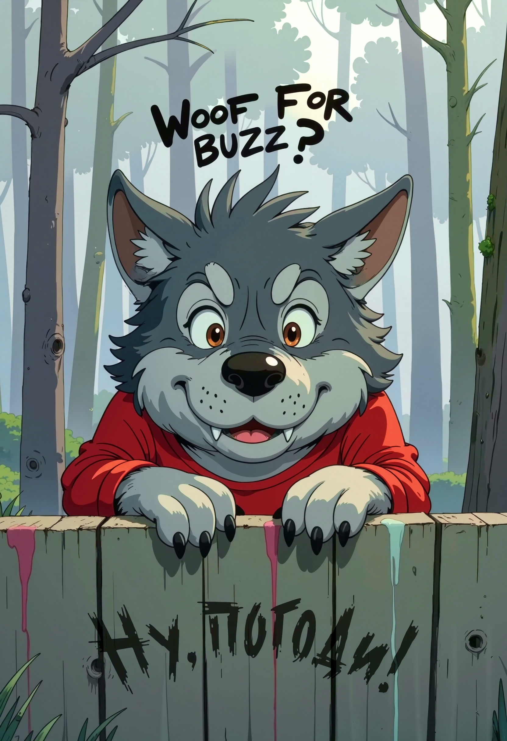 1qqq, Bratya_Piloti, (masterpiece, best quality, high-res, 4k textures, ultra detailed:1.25), cel-shading half-body of a Cute nypogodi wolf, red shirt and black pants, two long fangs, four white fingers black claws, peeking out from the top of the fence, Grass has sprouted between the boards, black graffiti in the center - bold italics:"WOOF FOR BUZZ?", oil painting leaks, wild crepuscular forest behind