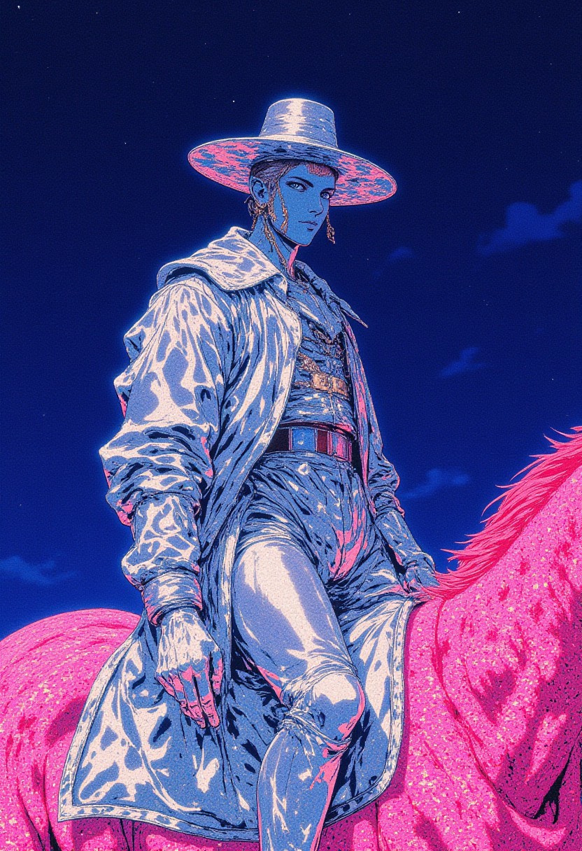 This is a highly stylized, digital artwork featuring a striking, androgynous figure mounted on a pink horse. The figure is adorned in a shimmering, reflective outfit that is predominantly silver, covered in thousands of tiny, glittering crystals. The outfit includes a wide-brimmed hat, a long-sleeved jacket, and high-waisted trousers. The outfit's texture is smooth and glossy, reflecting the light, creating a dazzling effect. The figure's face is obscured by the hat, adding to the enigmatic nature of the image. The horse is also covered in the same glittery material, making it appear as if it is made entirely of pink crystals. The horse's mane and tail are also covered in the crystals, adding to the overall glittery theme. The background is a deep, clear blue, providing a stark contrast to the bright, glittery elements of the foreground. The image has a futuristic, almost otherworldly feel, with a strong emphasis on texture and shine. The overall style is highly polished and detailed, with a focus on creating a visually striking and surreal scene.
