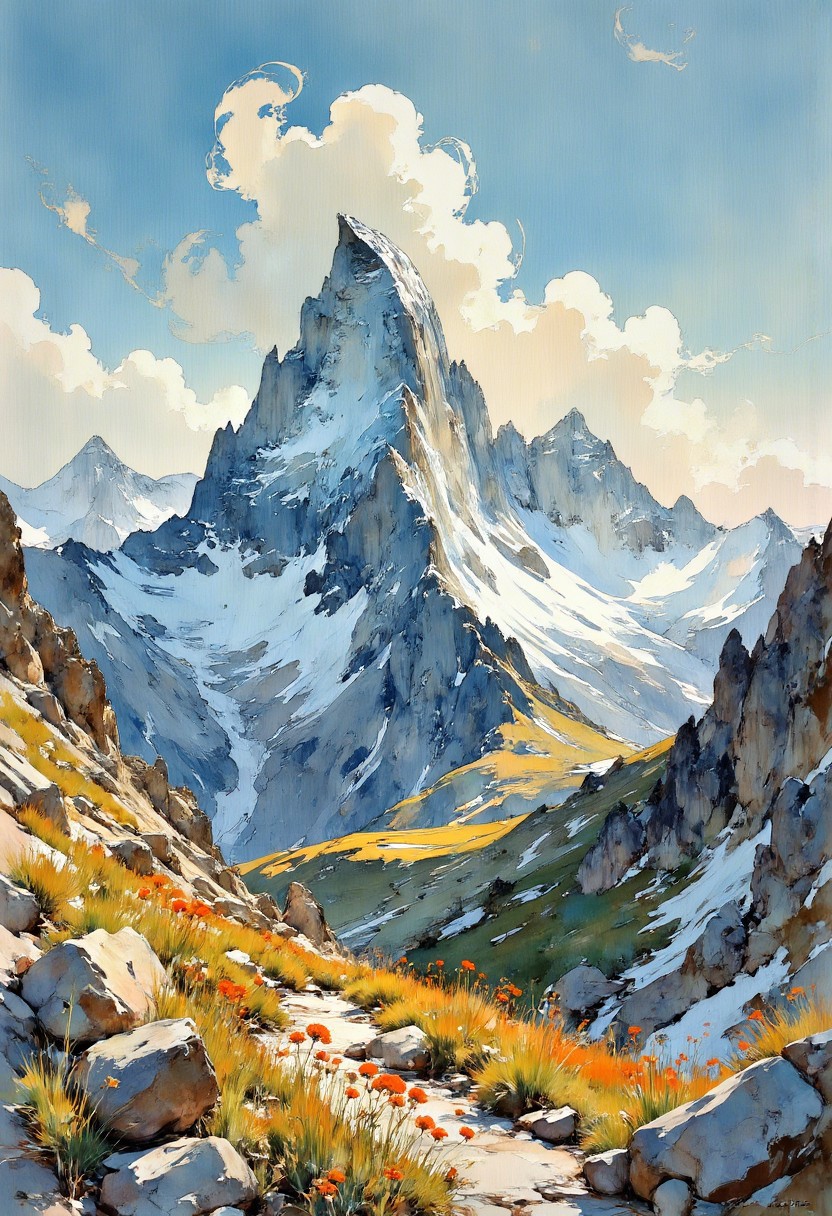 A high-detail watercolor painting of the Matterhorn, its iconic pyramid shape rising sharply against a backdrop of a vibrant, cloud-dappled sky. The mountain's rugged, snow-covered peaks shimmer in the soft light of dawn, with subtle gradients of blue, white, and gray blending harmoniously. The foreground features lush alpine meadows with scattered wildflowers in vivid colors, adding a lively contrast to the cool tones of the mountain. Rendered with delicate watercolor washes, the scene captures the grandeur and tranquility of the Matterhorn, emphasizing its striking presence and natural beauty.