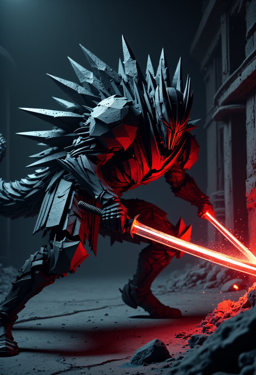 This digital artwork captures the intense moment as a futuristic, biomechanical warrior lunges toward the viewer mid-attack. The figure, a fusion of organic and mechanical elements, emerges from the shadows of a dimly lit industrial environment. Its dark, insectoid-samurai armor gleams ominously, with a biomechanical tail ending in a scorpion-like stinger arcing forward. The warriorâs helmet, with angular edges and glowing red eyes, locks onto the viewer. A glowing red katana is drawn, slashing through the air in a blur of deadly precision, creating a sense of motion and danger as the warrior springs into action. visiobrutalism.