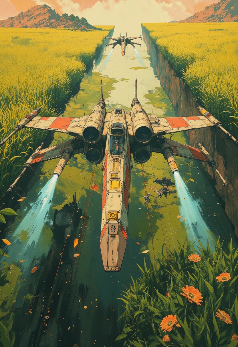 Create a photorealistic image of a pair of starwars x-wing fighter flying through a rice plantage, ((((top view)))), from a distance, wide angled, a light veil lies over the picture, a rich and complex image of nature, a vibrant web of digitally captured tones and textures, best quality, double exposure, realistic, captivating, fantastical, splash art, intricately detailed, hyper detailed, maximalist style, photorealistic, concept art, sharp focus, harmony, serenity, calm, mysterious glow, dynamic lighting, masterpiece, superb composition, finest details, highest aesthetic, ((front view)), mystical glow, best quality, sharp focus, high contrast, stylized, clear, colorful, ultra quality, 8k, best quality, masterpiece, award winning, a breathtaking masterpiece, award winning, DB4RZ, DB4RZ style painting, NeoPigma, in the style of cksc, anime, cyberpunk