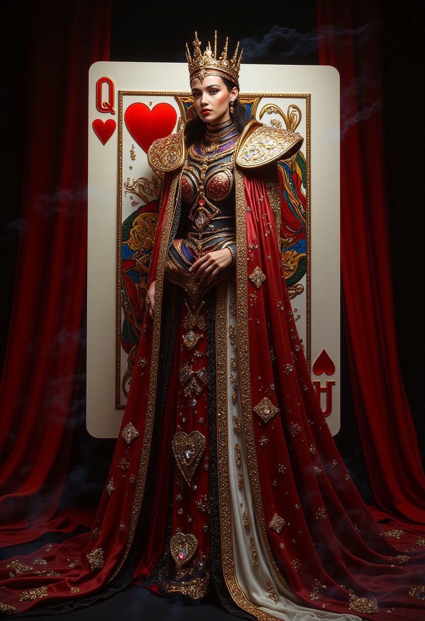 A majestic queen dressed in a regal gown inspired by the Queen of Hearts, standing confidently in front of a giant playing card featuring the heart suit. Her gown is intricately designed with gold embroidery, heart motifs, and a dramatic red and white color scheme. She wears a glowing golden crown encrusted with rubies and diamonds, exuding royal power. The background features a gradient of deep red to black, resembling a velvet curtain, with a faint magical mist swirling around. The edges of the playing card are polished and gilded, radiating elegance. The queen’s pose is graceful, with a flowing train decorated with card suit symbols. Add a surreal reflection of her face subtly in the card design, and ensure the overall scene feels mystical and enchanting.