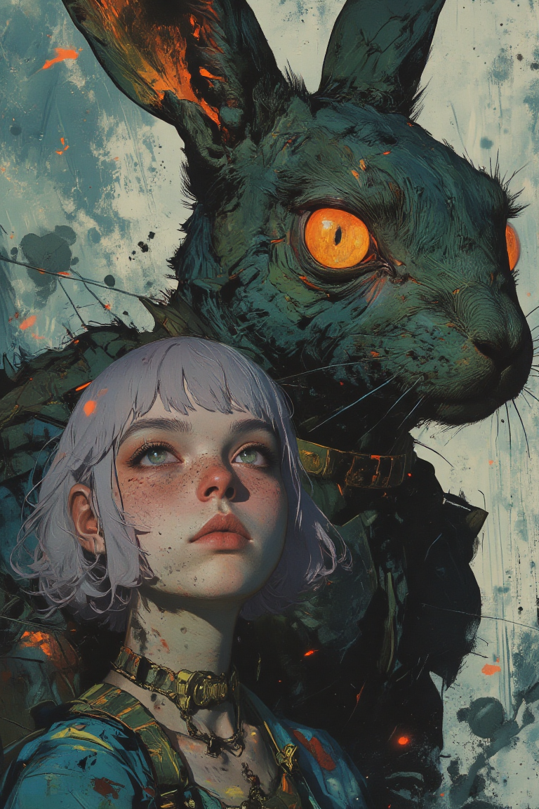 A highly stylized digitally drawn hyper-realistic midshot of a pale-skinned woman, inspired by Hayao Miyazaki's whimsical fantasy. Her shoulder-length lavender hair is styled in loose waves with delicate braids framing her face. Her wide, lilac-colored eyes shimmer with a dreamy, otherworldly glow. Her cheeks are softly flushed, contrasting a sharp, diamond-shaped jawline. Her full lips are painted a soft mauve. She wears pearl-drop earrings and a necklace shaped like intertwined tree branches. Her oversized creative gown is a flowing masterpiece of cobalt blue and lime green, adorned with intricate vine patterns. Standing beside her is a colossal rabbit, its ears adorned with golden jewelry and glowing softly. The rabbit's exaggerated size dwarfs the woman, and its large, expressive eyes radiate a serene, magical energy. The folds of her gown blend with the rabbit's fur, creating a seamless harmony between the two.