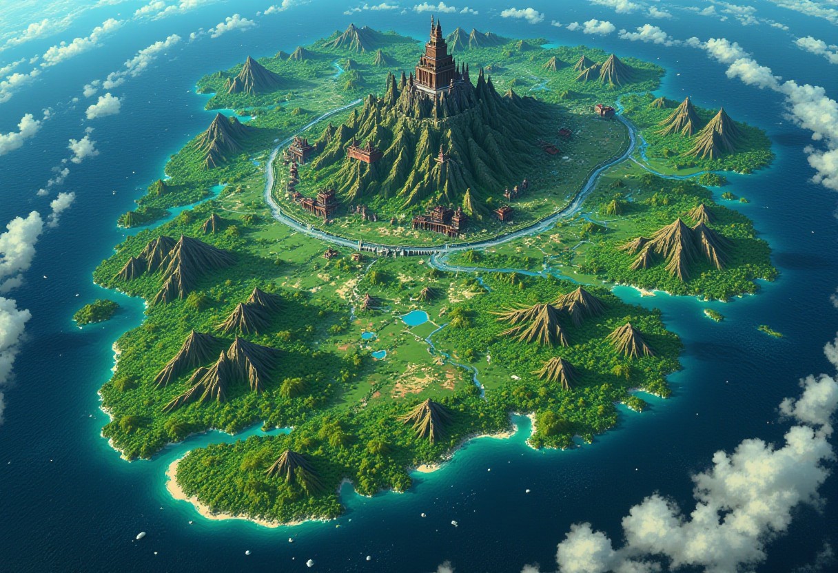 ((a anime fantasy world-map.)) the world map revealed a continent laying in the ocean with vast forests, cities ech with its own unique culture and charm, the world was vast and sprawling, dense forests, and winding rivers that snaked acroos the landscape like lifeblood, the world offers all kinds of biomes like jungle, desert, tundra, forest, vally and lakes, large waferfalls, huge trees and beaches as well as cliffs that reach into the water, the world has many small towns and a large city that is built of marble with large walls and a beautiful palace on a hill over a lake called Greifen Fels, bv-stuanilan, anime landscape, no humans, m4pdr4w, view from far above, from far above,