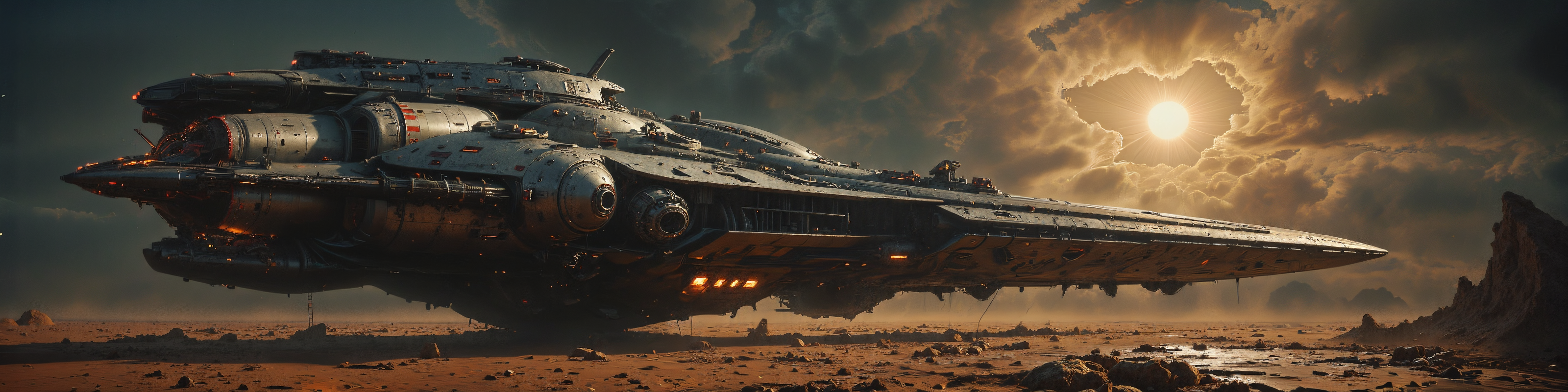 The scene is dominated by deep orange, black, and gray tones, evoking a desolate and dystopian atmosphere with an industrial edge. Styled as a retro scan of an 80s sci-fi book, the image exudes a grainy, lofi textureâmelancholic yet hyper-detailed and cinematic. At the center lies a colossal spaceship, sleek and aerodynamic, with a design reminiscent of a predatory bird. Its sharp, streamlined hull is constructed for speed and power, blending jagged edges with smooth, flowing surfaces. Gigantic wings extend outward, their edges razor-thin, while massive rocket engines are mounted on either side, scorched and battered from a catastrophic descent. The vesselâs once-pristine black-and-gray exterior is marred with weathering and faded orange hazard markings, adding a haunting sense of abandonment. Like a fallen predator, the ship looms over the cracked, barren wasteland, its silhouette sharp and imposing against the fractured landscape. Jagged tears in its hull expose intricate mechanical innards, hinting at the advanced technology now left to decay. The surrounding terrain is littered with debris, scattered remnants of the shipâs crash, while a hazy, storm-filled sky churns overhead. Dark gray clouds ripple with faint beams of pale light that struggle to penetrate the ash and dust, illuminating the devastation in haunting bursts. Volumetric lighting, swirling particles, and gritty textures emphasize the shipâs fallen majesty, creating a retro-futuristic aesthetic that captures both the menace and the tragic beauty of a technological leviathan lost to ruin. <lora:flux.1_lora_flyway_Epic-detail_v2.safetensors:0.5>, <lora:ck-skynet-000019.safetensors:0.4>, <lora:aiai-Glimra-Flux-Dev-v2.safetensors:0.5>, <lora:artilands.safetensors:0.35>, <lora:NotTheRealWorld-v55-000010.safetensors:0.2>, <lora:- Flux1 - soothing_atmo_V2.0.safetensors:0.45>, <lora:n30nfilm.safetensors:0.8>,
