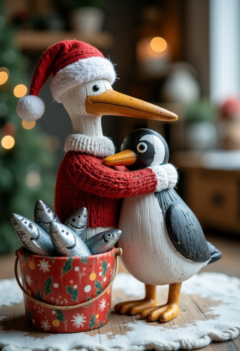 A high-quality, close-up photograph of a ck-owct style hand-painted wooden christmas toy featuring a pelican wearing a christmas sweater and hat hugging a cute wooden toy penguin. On the floor beside their feet is a bucket of fish, the bucket is wrapper in christmas wrapping paper with the fish visibly flowing over in the bucket.