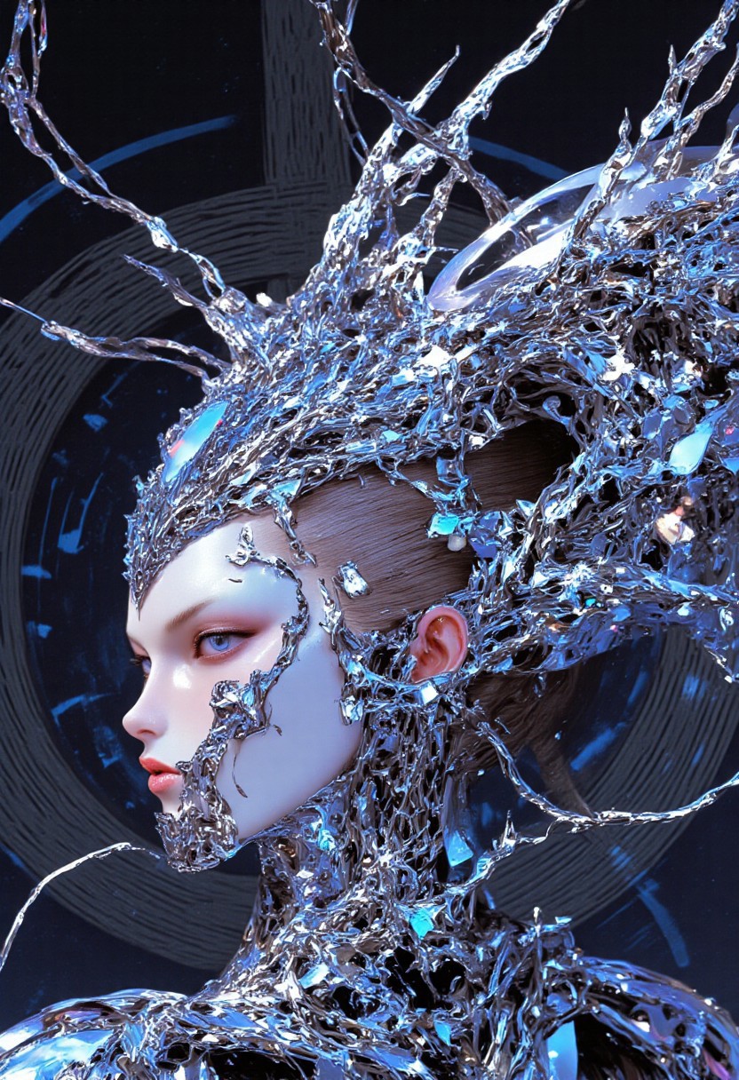 She stands as a conduit between the organic and the artificial, her glowing blue eyes reflecting the eternal tension between humanity and technology. The chrome headdress, like a crown of a forgotten future, intertwines with her being, embodying the eternal dance of power and fragility, while the pulsating circuits on her skin echo the infinite, unseen currents of life that flow through both machine and flesh.
