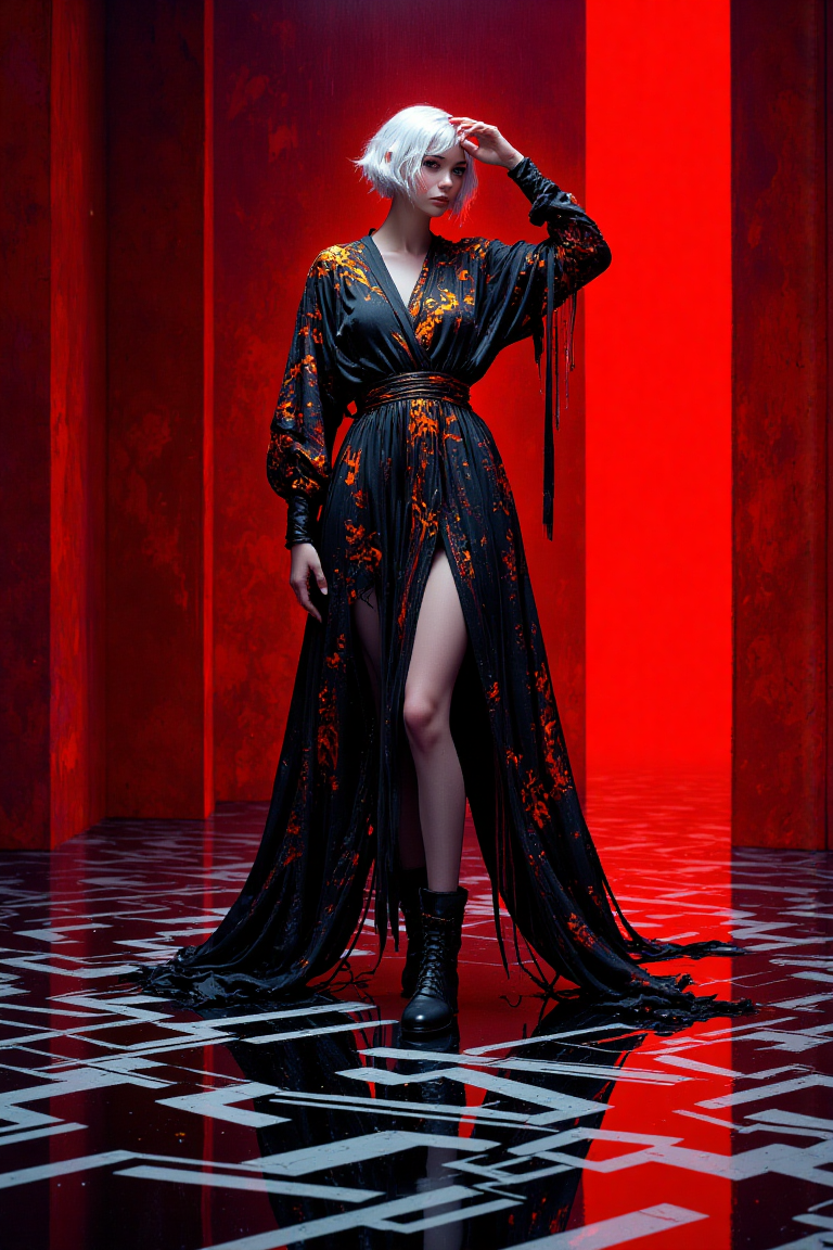 A lithe, androgynous figure with ivory skin and short, wavy platinum hair stands in a crimson room, the light subtly illuminating their angular features. They wear a dark charcoal robe, its smooth, matte texture adorned with delicate embroidery of golden flames, subtly glowing as if alive. The robe drapes asymmetrically, one side flowing to the floor and the other cut sharply at the thigh, revealing leather boots. The floor is a polished black surface with an intricate maze of white linear patterns, twisting into a non-repeating angular labyrinth that seems to recede infinitely. Their pose is dynamic yet graceful: they stand with one arm raised as if to shield their eyes, the other outstretched behind them, fingers splayed as though casting energy into the scene. Inspired by the geometric forms of Escher and the avant-garde works of Iris van Herpen. High quality rendering. 8K.