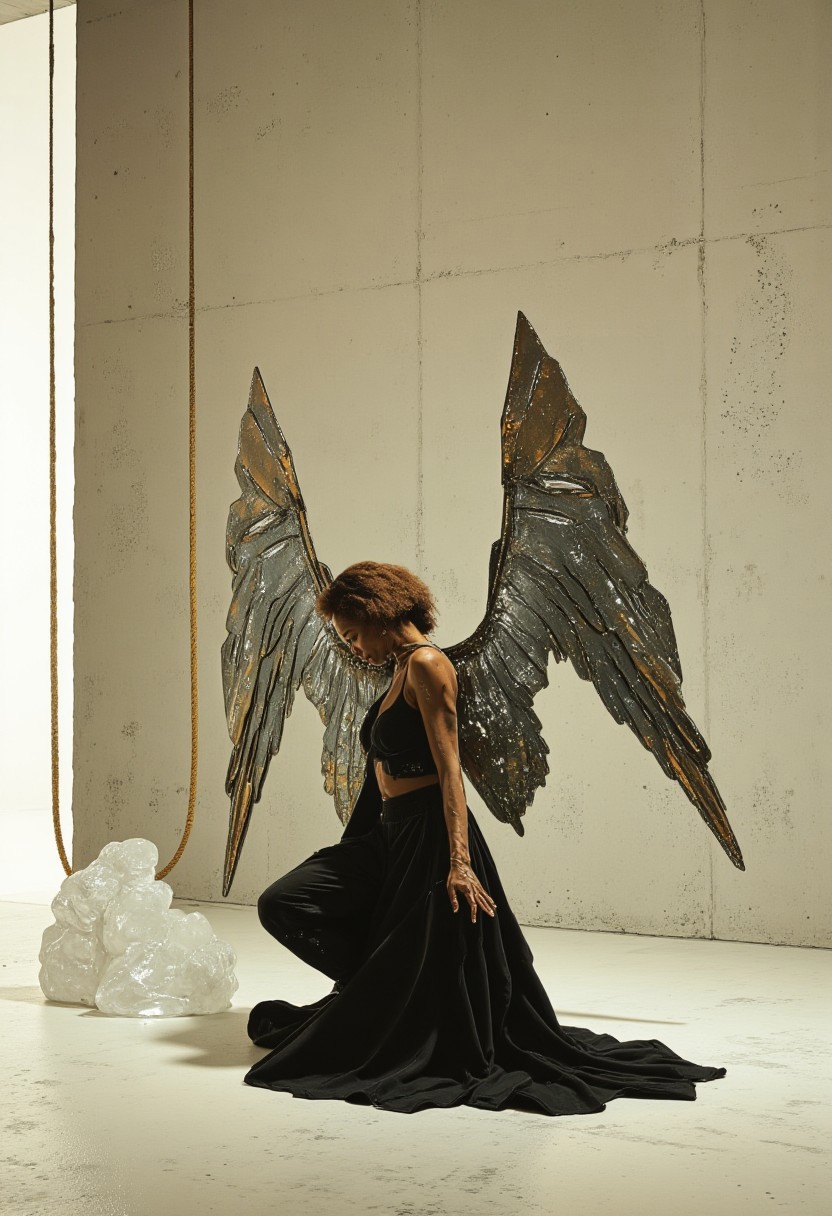 A highly stylized indoor fashion portrait of a medium-brown-skinned woman, kneeling gracefully in the center of a minimalist, alabaster-colored room. She has a sharp, modern bowl cut hairstyle that frames her face with clean, angular lines. She wears an avant-garde ensemble, a flowing gown made of black velvet panels, sewn together in sharp, asymmetrical angles, giving it a deconstructed, fashion-forward look. Her wings are crafted from thin, intricate laser-cut steel sheets, stacked and layered to form a bold, futuristic shape with shimmering silver accents that catch the light. The soft illumination from a large window to the side casts dramatic shadows of her wings onto the white marble floor, enhancing the stark contrast between the softness of her gown and the strength of the steel. In the background, ropes stretch across the frame from left to right, adding a dynamic, architectural element that frames her figure, subtly drawing attention to her powerful yet graceful presence. A clear glass sculpture rests nearby, its reflective surface mirroring the crisp edges of her wings, creating a visual harmony between organic form and industrial design. The lighting is dramatic yet soft, creating a perfect balance of strength and vulnerability in this captivating scene.
