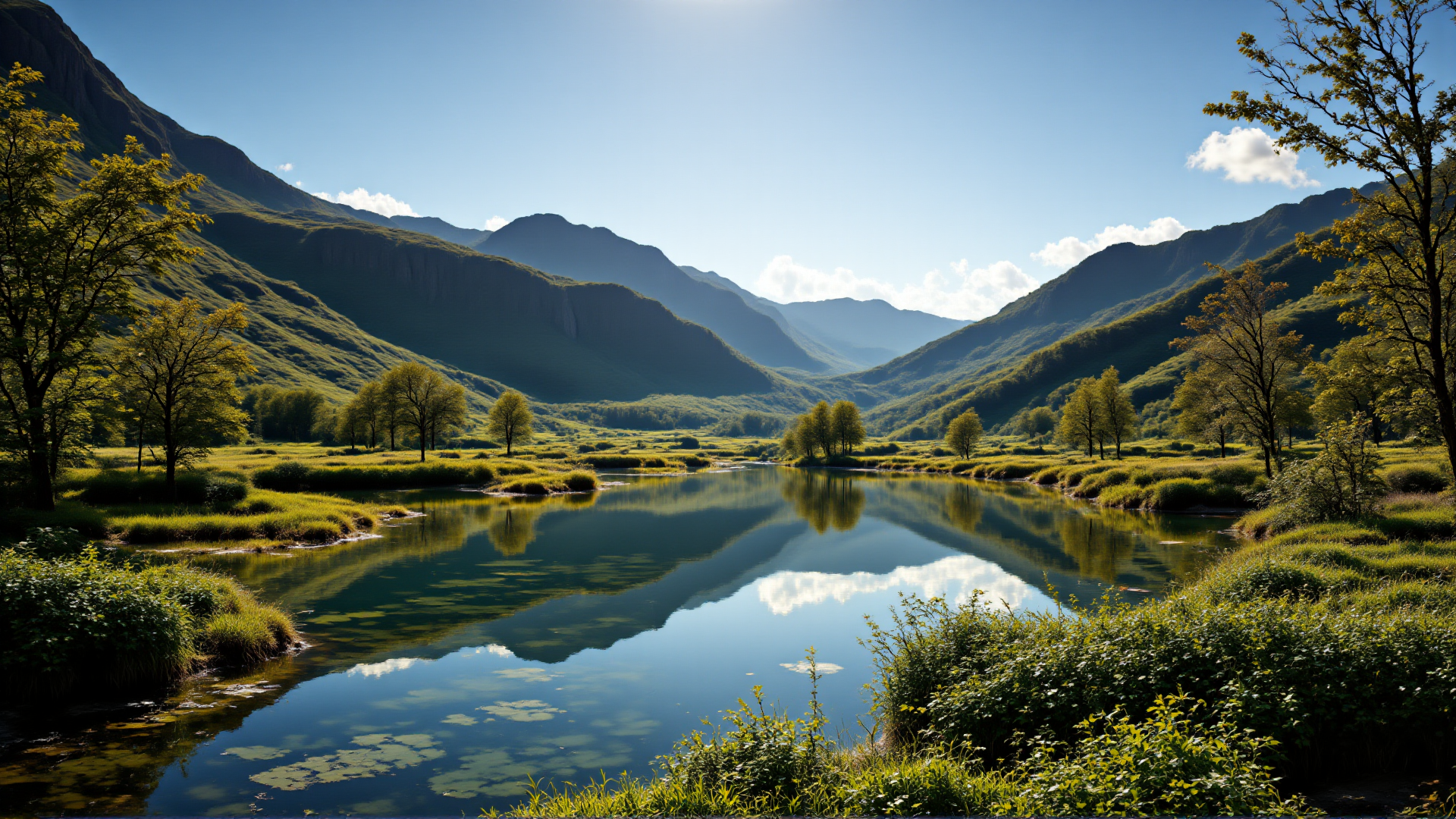 a photograph of A peaceful, sunny day in a lush valley, with a calm river flowing gently through the terrain. The river perfectly reflects the distant mountains, their peaks bathed in warm, golden sunlight. The sky is clear and bright, with only a few wisps of clouds, and the sunlight creates a shimmering effect on the water's surface. The surrounding valley is filled with vibrant green meadows and gentle slopes, adding to the serene and tranquil atmosphere. The landscape is quiet and untouched, offering a sense of calm and harmony as nature unfolds in its full beauty. aidmafluxpro1.1