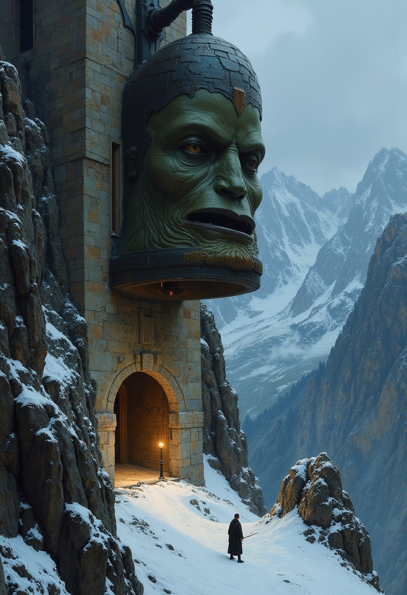 oil painting of psycho_4rt, mythp0rt, cinematic wide angle, a massive hanging bell with a grotesquely contorted screaming face etched into its surface, suspended at the peak of a weathered, ancient watchtower. The tower rises defiantly amidst a vast expanse of jagged, snowy mountains, their peaks shrouded in mist and illuminated faintly by a pale, cold light. A single torch flickers near the entrance of the tower, casting eerie, dancing shadows onto the surrounding stonework. Snow falls gently but relentlessly, blanketing the landscape in a haunting quiet. The bell's metallic surface gleams faintly in the low light, its ominous presence dominating the scene. The atmosphere is heavy with unease, a surreal blend of isolation, dread, and the unsettling stillness of the winter wilderness., visible brushstrokes, atmospheric haze, low key, moody lighting,watercolors,DB4RZ, DB4RZ style painting photorealistic rendering, mody chiaroscuro lighting