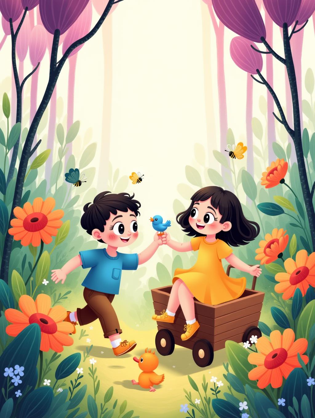 This image is a vibrant digital illustration featuring two children in a whimsical garden setting. The children are depicted with large, expressive eyes and cheerful smiles. The boy on the left has short, dark hair and is wearing a blue shirt and brown pants. He is reaching out to a small bird perched on a branch. The girl on the right has long, dark hair and is dressed in a yellow dress and yellow shoes. She is sitting on a wooden cart, which is pulled by a small, friendly-looking duck. The garden is filled with large, colorful flowers in shades of orange, red, and pink, along with lush green foliage and small white and yellow flowers. There are also various insects, including butterflies and bees, adding to the lively atmosphere. The background features tall, slender trees with purple and pink leaves, creating a dreamy, magical feel. The overall style of the illustration is vibrant and playful, with a soft, pastel color palette that gives it a fairy-tale quality. The scene is set in a serene, fantastical garden, full of vibrant colors and enchanting details. <lora:KicezArtCute_illustrationV2:1>