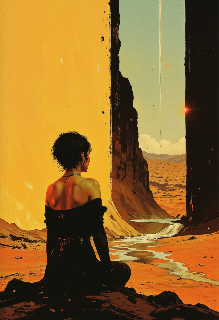 A highly stylized, digitally rendered photograph features a woman seated in a minimalist, desert-like setting with surreal undertones. Positioned elegantly on her left side, her back faces the viewer, revealing a slender frame and fair skin. Her short, tousled dark hair complements the simplicity of her black, off-the-shoulder dress, which drapes snugly over her figure. A delicate necklace of small, gold-colored beads cascades down her back, subtly shimmering in the golden sunlight. The desert stretches out with smooth, undulating dunes bathed in warm light. Shimmering, translucent ribbons of light flow across the sand like liquid threads weaving through the dunes. The sky above transitions into an iridescent gradient, deepening toward the horizon and enhancing the dreamlike quality. To the right, a large vertical rectangular opening frames the vast desert, but within it, the dunes appear inverted, distorting the natural order and hinting at a warped reality. Non-linear black-and-white lines intersect throughout the scene, creating optical illusions. These lines twist and curl unpredictably, disrupting the serene atmosphere while adding a hypnotic element. The interplay of light, shadow, and distortion invites viewers to question the boundary between reality and illusion, pulling them deeper into the tranquil yet mysterious ambiance.