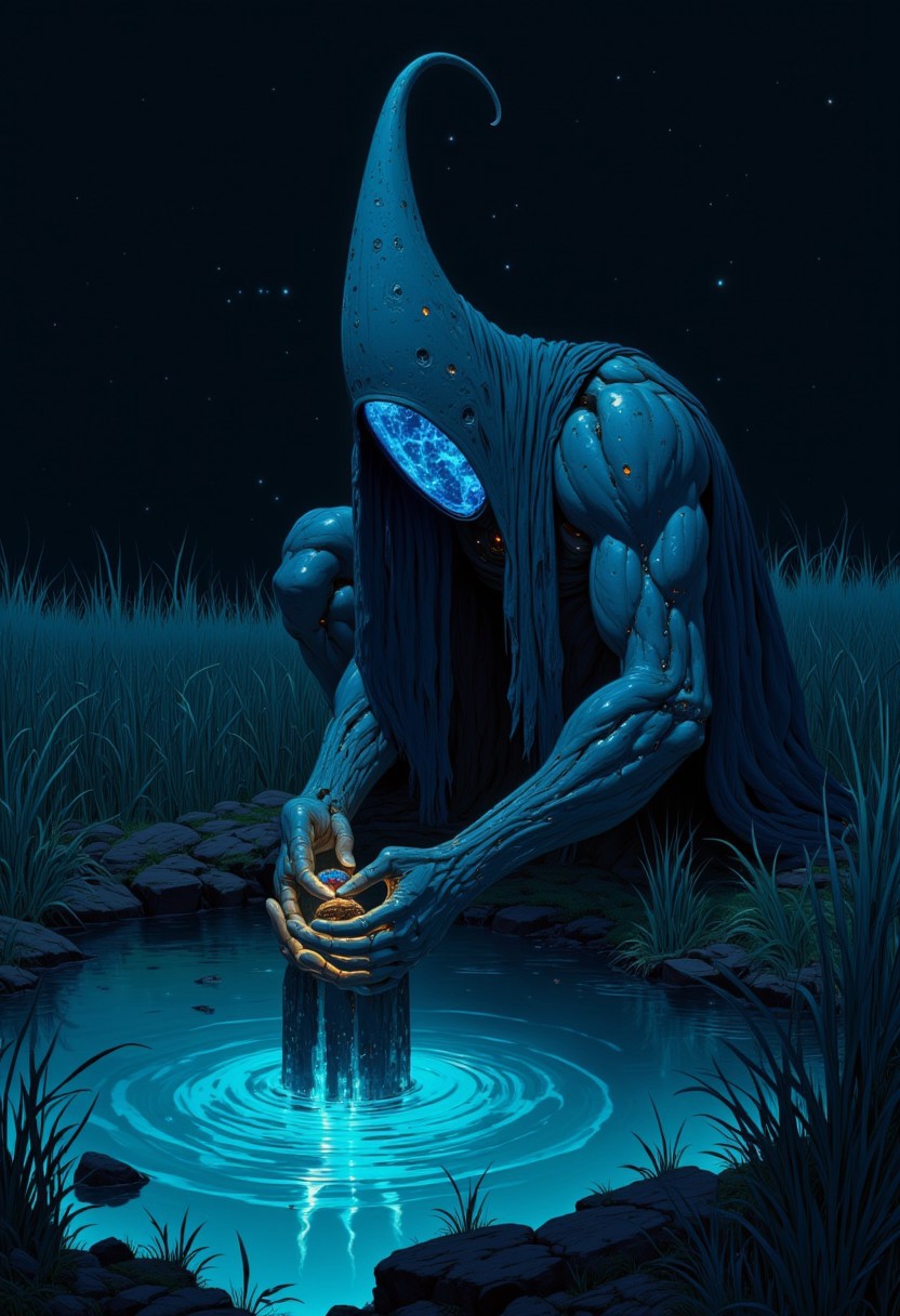 The humanoid figure crouches by a small pond, the water glowing in gentle azure swirls as it reflects the serene night sky. In their strong hands, they cradle a tiny, glowing fish whose scales pulse like starlight. The visor gleams with the same calm blue, illuminating ripples in the water. Tall grasses bend slightly as if in reverence to the figure’s presence, and tiny motes of light drift upward like scattered sparks. Their massive wizard’s hat tilts forward, its edge nearly touching the water’s surface as if to share in the moment’s fragile magic.