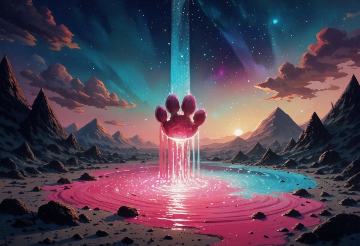 A surreal cosmic landscape featuring a glowing, ethereal catpaw suspended in the starry night sky. The catpaw appears to be melting, with vibrant, magenta and turquoise liquid energy swirling around it. The environment is otherworldly, with jagged glowing lime green crystals and shadowy mountains framing the scene. The sky is alive with stars and nebulas blending hues of deep indigo, purple, and magenta. Clouds tinted with warm bordeaux and crimson contrast the cool tones, adding depth. The flowing liquid radiates a mesmerizing luminescence, creating intricate ripples and light reflections across the ground. The atmosphere feels mystical and infinite, a fusion of cosmic power and ethereal beauty,oilpainting