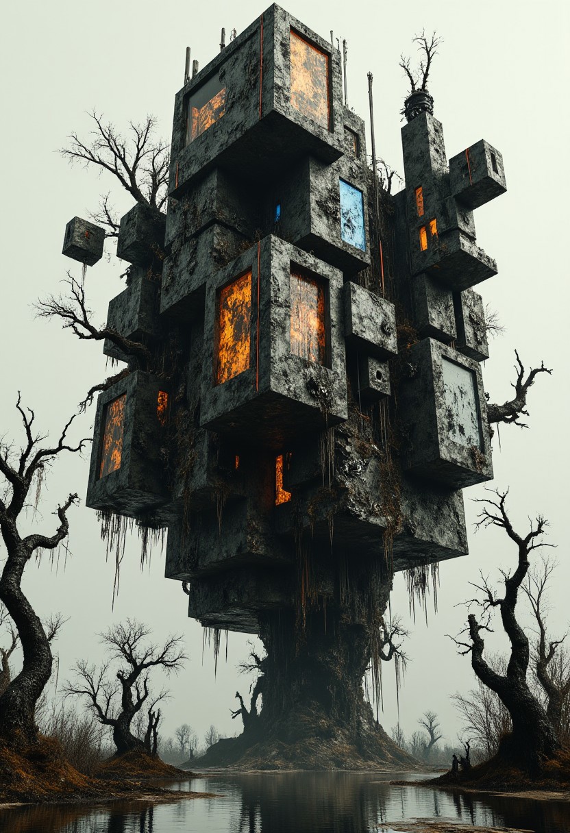 ff-desolascape, a large geometric building rising from a swamp, constructed atop the exposed skeleton of an ancient giant. The structure is composed of stacked geometric objects. Ancient, petrified trees grow out of the building, their gnarled roots merging into its walls. Small fires flicker within others. Gears and mechanical parts are integrated into the structure. Quiet tension, majestic and alien amidst the eerie swamp.
