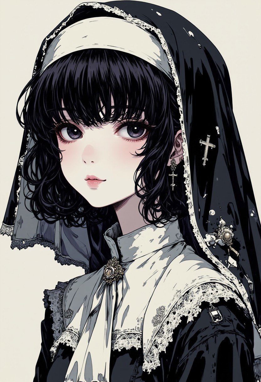 in the style of cksc, studio anime art, detailed ink sketch, high quality digital illustration. A close-up of a goth girl in a nun’s habit, her face adorned with a soft, shy smile. Her short, stylish haircut features layered waves that frame her face beautifully. Her dark eyes are slightly downcast, surrounded by a faint, smoky eye makeup that enhances her innocent appearance. A small silver cross earring glints against her cheek. The delicate shadowing on her face and the intricate detailing of her habit create a striking, ethereal look. (hyperdetailed layered hair and shy smile:1.1), (intricate cross earring and fabric texture:1.1), (Refined gentle, moody lighting:1.1), (best quality:1.1), (high resolution:1.2)