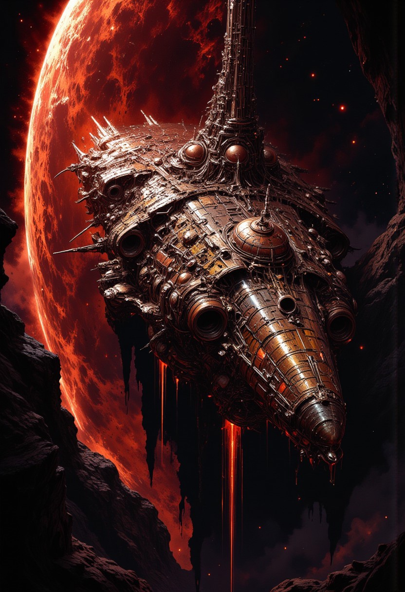 Amidst the endless void of space, a derelict spaceship drifts silently in the orbit of giant bright red sun, its bright metallic hull scarred by time and forgotten battles. The ship’s structure is vast, broken and crumbling, with patches of glowing alien substance overtaking its once pristine surfaces. Stars twinkle faintly in the deep sky, casting a soft, eerie light on the wreckage. The scene exudes a feeling of melancholy, as if the ship is a ghost of a forgotten era, lost to both time and space. The dramatic contrast between the decaying spaceship and the starry backdrop adds a fantasy twist to this sci-fi setting. Inspired by John Harris, Chris Foss, and H.R. Giger,rust,dirt,complexity,suspenseful,lost technology,futuristic, haze,mystical touch,best quality,masterpiece,epic scale,no humans,light particles,high resolution,acid colors, intense colors,professional,dynamic composition,in motion,dynamic angle,extreme detailed,(close-up:1),low angle, John Berkey, Ridley Scott,Zdzislaw Beksinski,godrays,directional lighting, reflections,cinematic