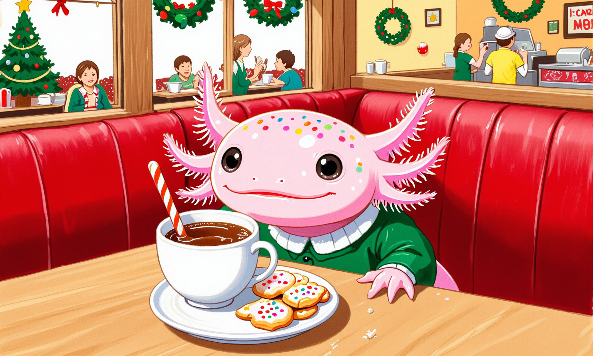 simple colorful crayon portrait art of tiny anthropomorphized axolotls, close-up of a pink axolotl nestled in a little vintage booth of a diner decorated for the holidays, seated next to a small plate of festive sugar cookies topped with sprinkles; its round black eyes sparkle as it holds a tiny cup of hot cocoa with a candy cane stirrer; the dinerâs booths are decorated with garlands and ornaments, and the tilt-shift effect blurs the cheerful holiday lights, wreaths, and other diners, creating a charming, nostalgic holiday diner scene filled with joy and warmth, the axolotls are clothed and have pink frilly gills and round black eyes<lora:Axomodel_Flux_V1.1.safetensors:1.0:1.0> <lora:ColorfulDigiArt_TheDesigner.safetensors:0.3:0.3> <lora:qiu_crayon.safetensors:1:1>