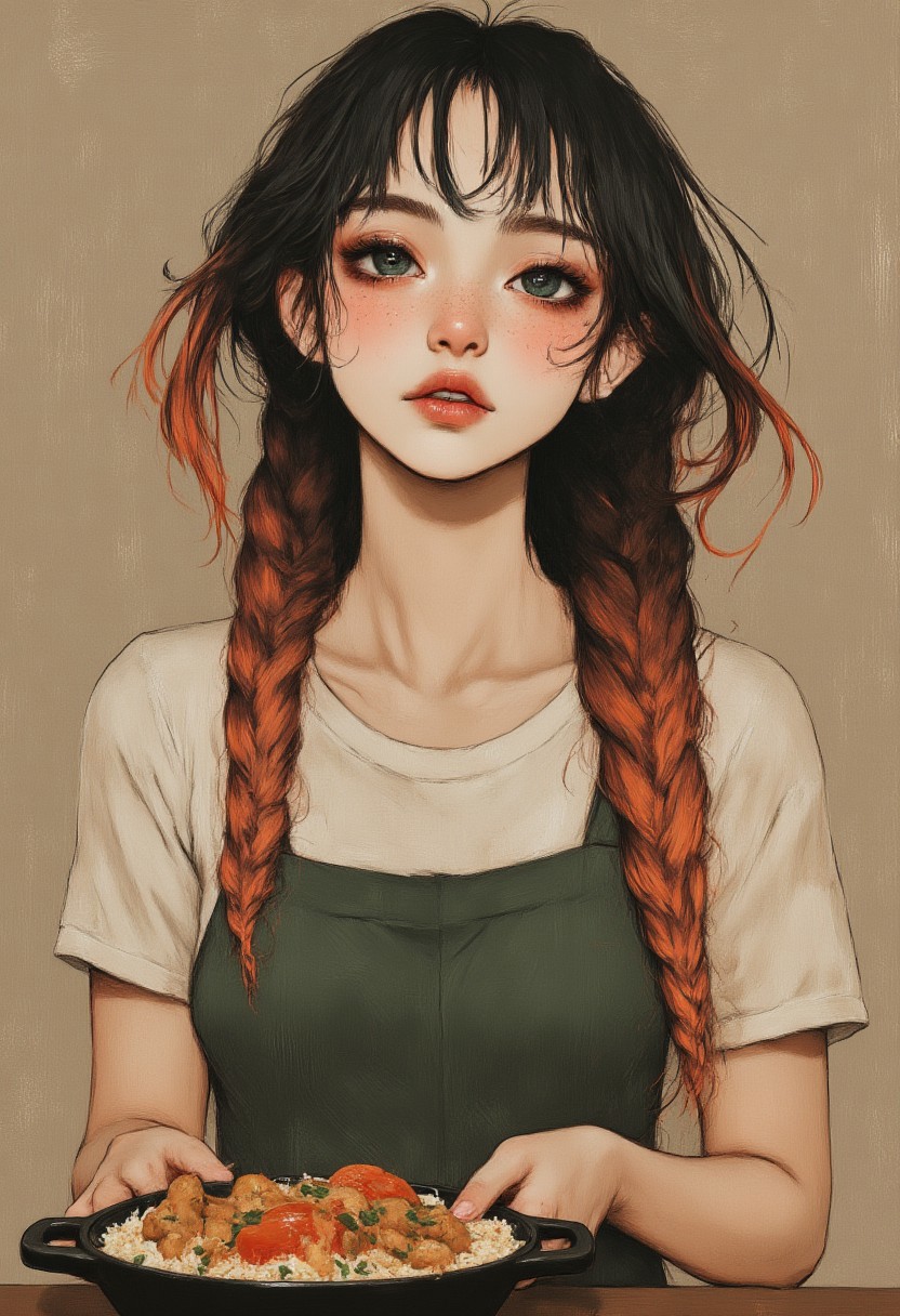 MoodyGirls, busty Asian woman with a large big braid wearing an apron and cooking dinner. soft smile