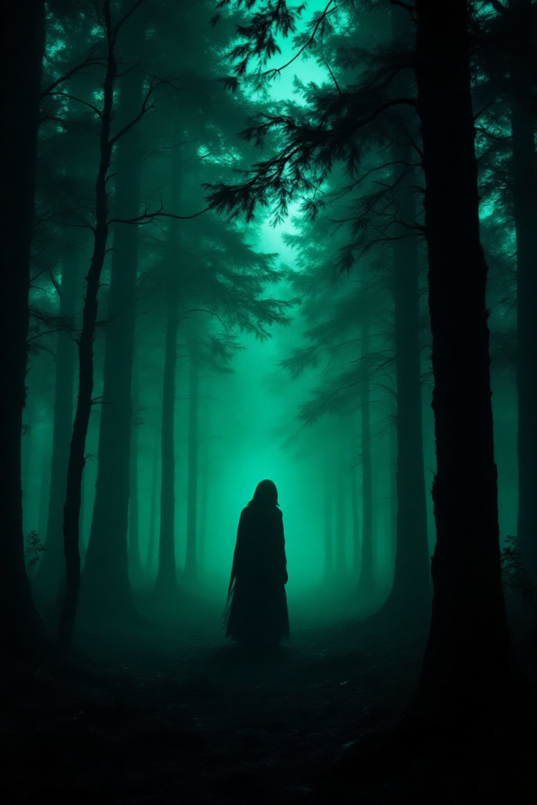 A melancholic forest twilight, bathed in a hauntingly beautiful ambiance. The camera lingers on a lone figure, shrouded in an atmospheric haze, as the trees' silhouettes pierce through the darkness. Faded greens and deep blues dominate the palette, punctuated by unusual dark colors that seem to absorb the light. Cinematic lighting casts long shadows, evoking a sense of foreboding. The subject's pose is contemplative, lost in thought amidst the mystical silence. Film grain texture adds an air of realism, as if this were a frame from a masterful cinematic production.