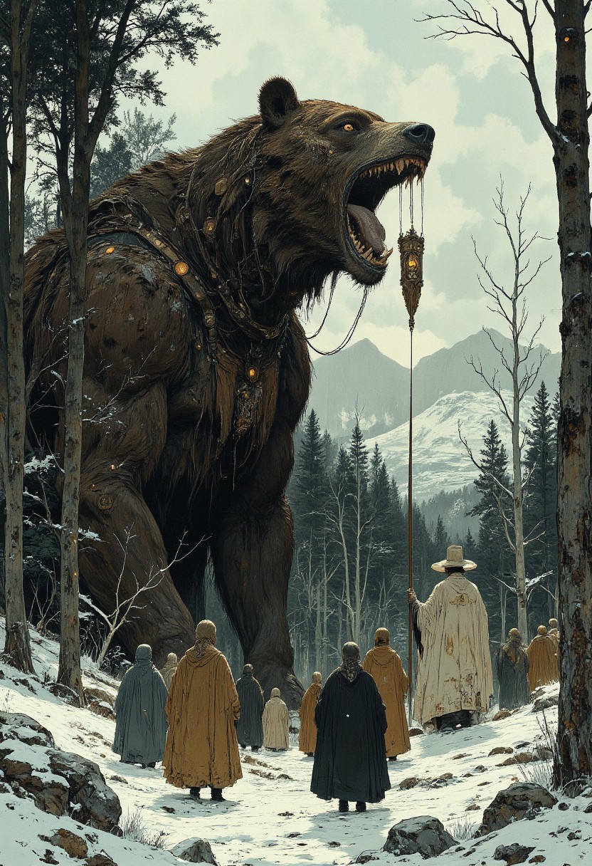 A medieval Russian man with a bear's head in a white shirt walks towards girls in a winter forest, in the foreground women run away in horror, in the background a bearded old man in rich white clothes and a hat with a staff watches from behind a tree