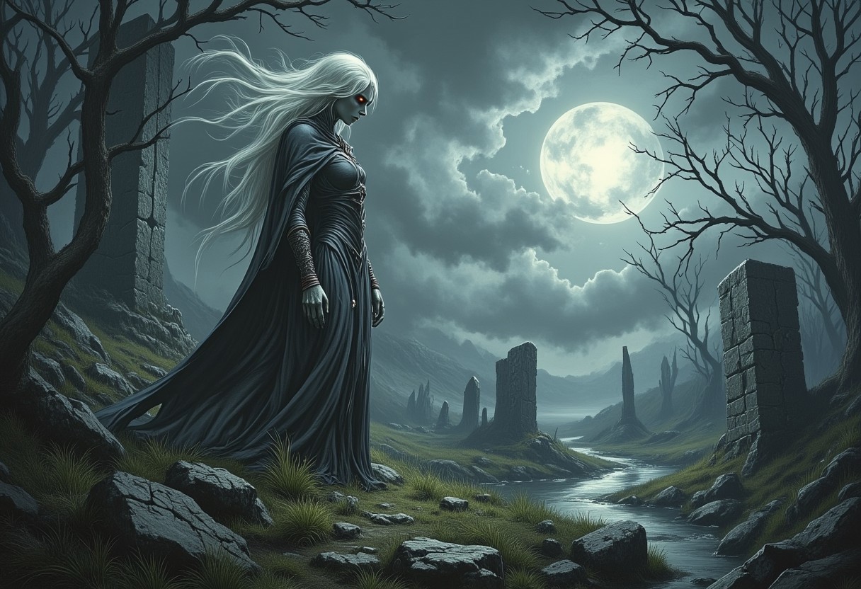 ArsMJStyle, dnddarkestfantasy, monster, nightmare, fear. "Under the silver light of a full moon, a Banshee emerges in a desolate, sorrowful landscape. She stands atop a hill of withered grass, surrounded by ancient dolmens and moss-covered stones that exude an aura of antiquity. Her spectral figure is ethereal, draped in a long, tattered cloak that billows as if caught in a phantom wind. Her long, white hair floats around her like a misty halo, while her pale, grief-stricken face reflects a deep, unfathomable sorrow. With sunken, glowing eyes, she gazes into the distance, her haunting wail echoing through the night, sending chills down the spine. The sky is blanketed with low, gray clouds, and a faint mist winds through the gnarled trees of a nearby forest. In the distance, a dark, winding river faintly reflects the moonlight, completing the atmosphere of death and foreboding that permeates the scene."