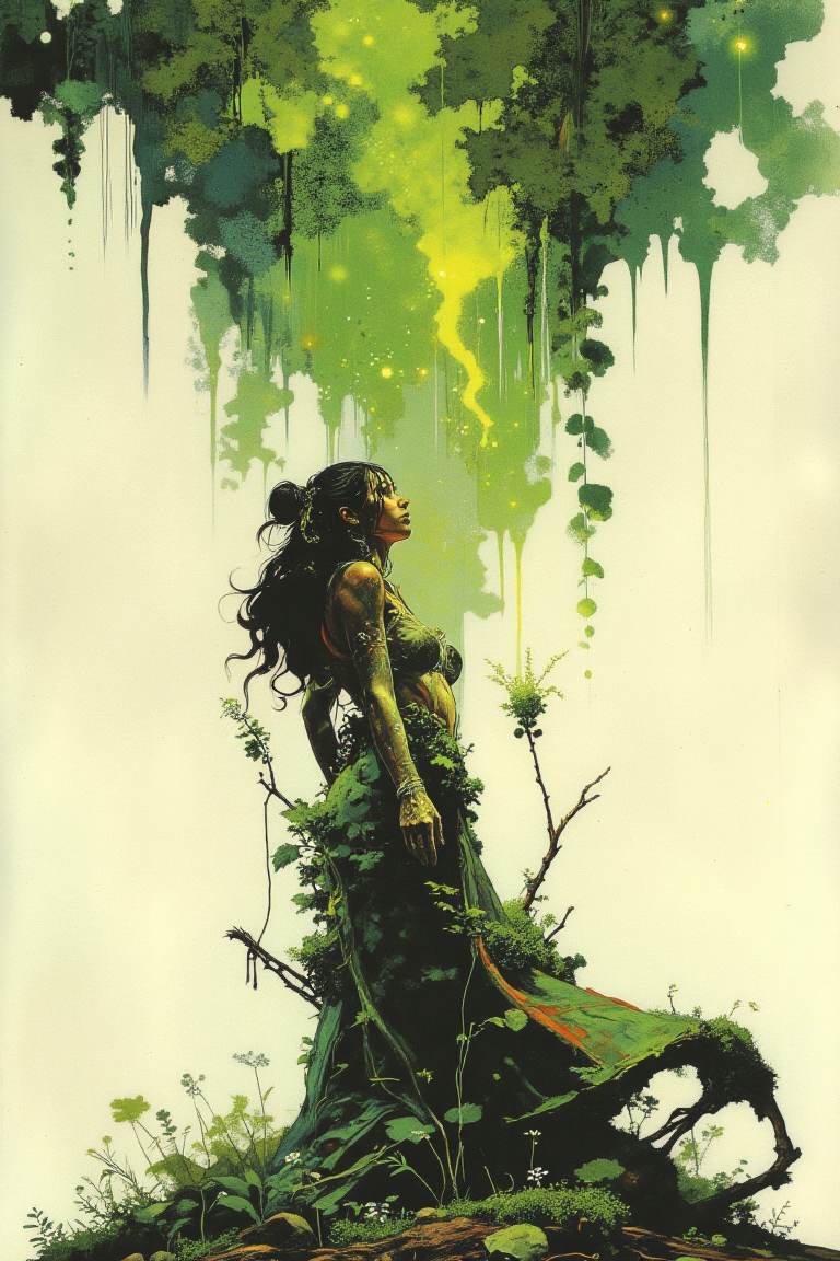 A modern art composition featuring a serene woman with flowing emerald-green hair, cascading like vines intertwined with leaves, moss, and small white flowers. Her skin appears textured like aged bark, etched with delicate, gold-lined cracks, evoking nature’s resilience. She stands in profile, wearing an avant-garde gown constructed from layers of living foliage and twisted branches. Her gaze is tranquil as her outstretched hand releases a cloud of glowing fireflies that merge into an abstract canopy above her. The background is a minimalist white canvas splashed with vivid green brushstrokes, representing chaotic yet harmonious growth, while the floor beneath her transforms into a garden patch, blurring the boundary between subject and installation.