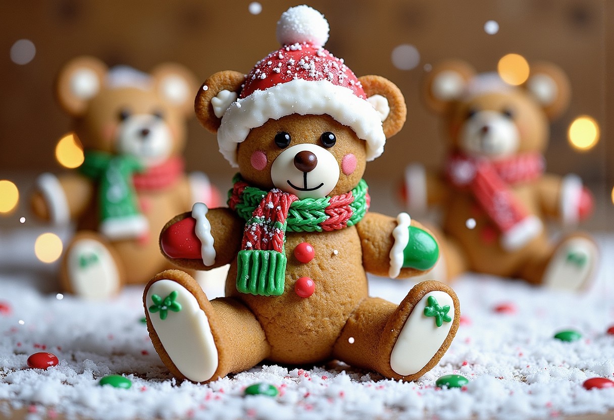 Teddy bear has a characteristic plush shape, with a rounded head, short paws and large ears. His body should be small to match the size of a gingerbread cookie. The main color of the bear is warm brown, reminiscent of the color of gingerbread dough. You can add lighter or darker shades to create texture and volume.. Decorate with icing: