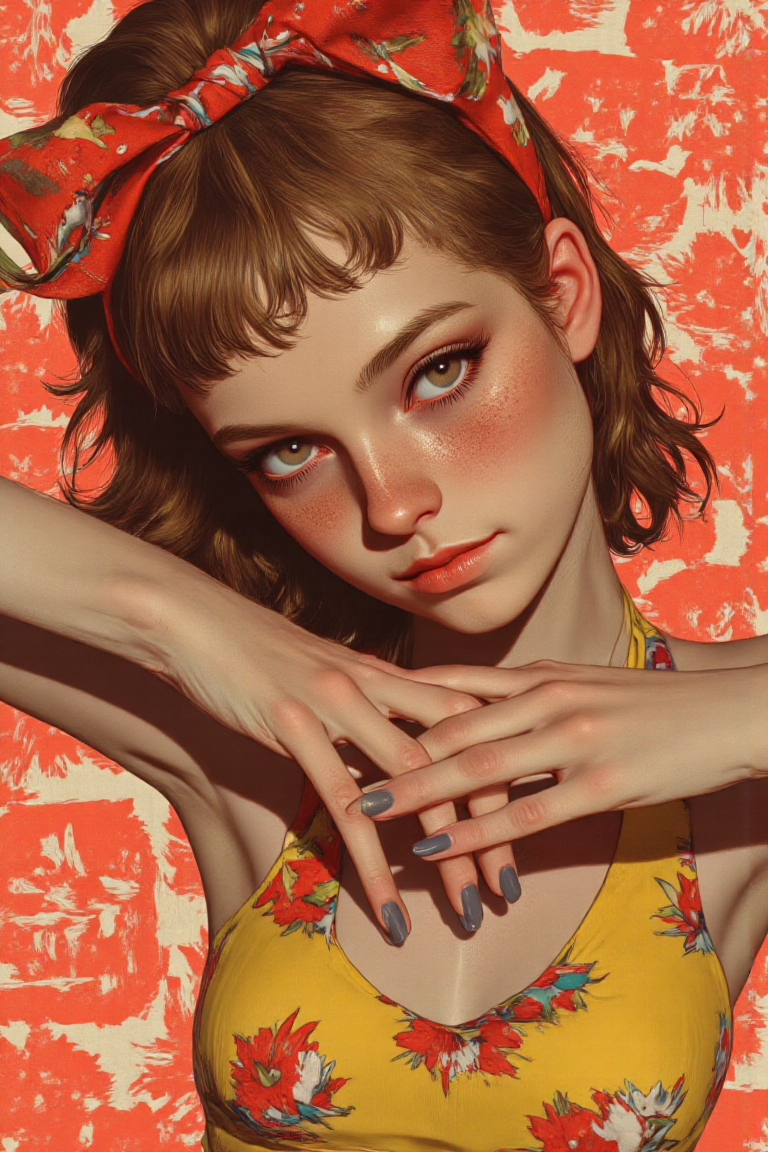 <lora:8a3a5085-db80-44fe-a910-f51f867f0265.TA_trained:1.00>((animaport))A vibrant, hyper-realistic upper-body portrait of a sun-kissed woman with warm, bronze skin and soft freckles. Her wavy, caramel-colored hair is styled into a loose, voluminous ponytail, tied with a vivid tropical silk scarf. She wears a bright yellow halter top with bold red accents and chic mesh gloves that extend halfway up her arms. Her pose, "Sultry Lean", captures her leaning forward slightly, with one gloved hand resting gently on her collarbone while the other lightly tugs at her scarf. The background is an explosion of retro pop art in coral and tangerine hues, featuring stylized palm leaves and vintage travel ads for a lively, tropical vibe. High quality rendering.