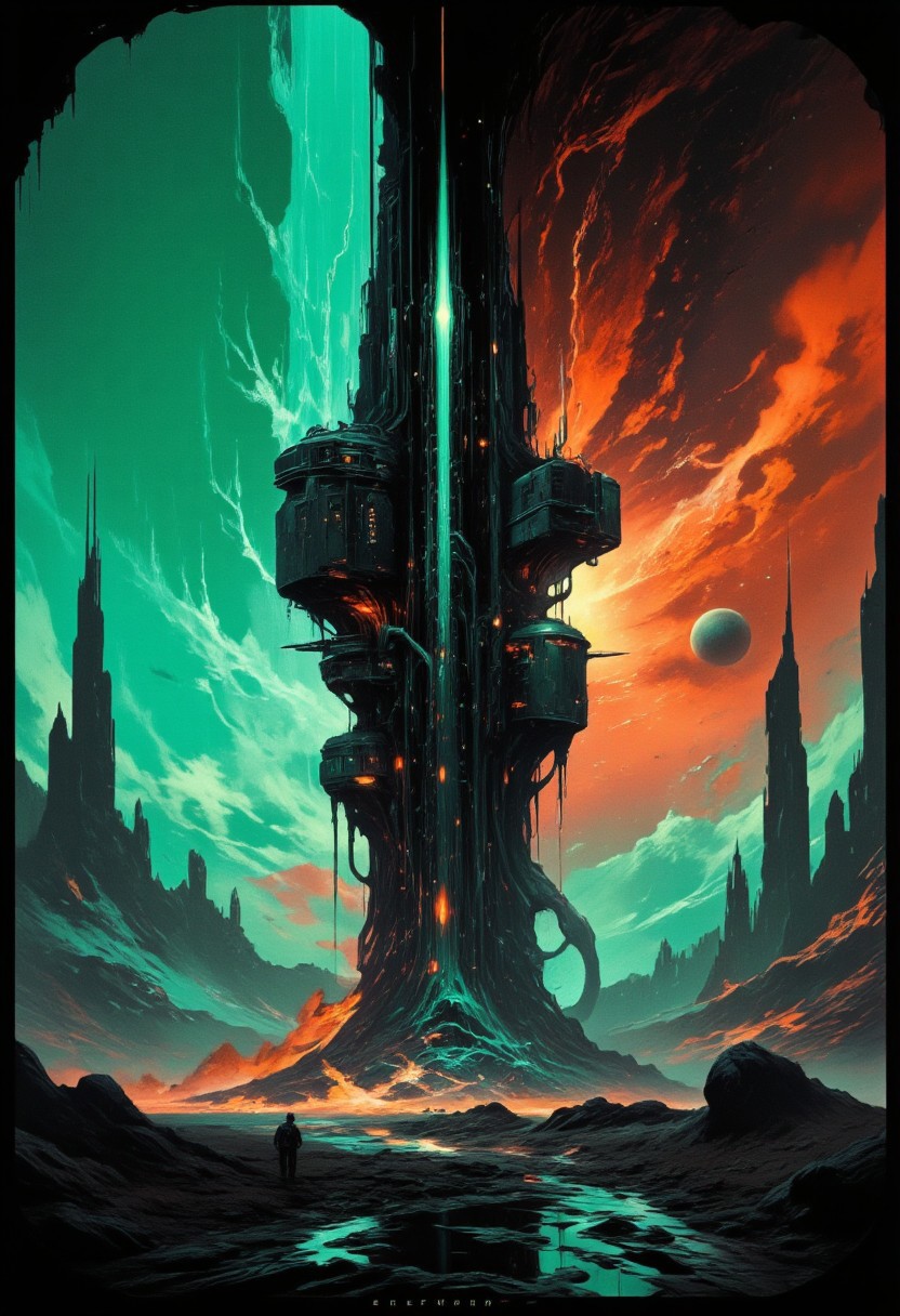 This is a digital artwork depicting a towering, giant endless geometrical tower, set against a dramatic, scifi backdrop. The tower is constructed with a metal, and small glowing geometrical windows. The structure is illuminated by a few bright dramatic, red lights, casting a neon glow. The background is a swirling, chaotic mix of emeralds and deep oranges, with a large, glowing cyan orb or vortex on the background of the image. The swirling colors create a sense of movement and chaos, suggesting a stormy or futuristic atmosphere. The ground beneath the tower is a dark alienscape, with a few small, shadowy silhouettes, adding to the sense of isolation and desolation. The overall mood of the artwork is mysterious and mesmerizing, with a sense of unknown or exploration. The texture of the artwork is highly detailed and realistic, with a focus on the appearance of the tower, enhancing the sense of scifi and domination. The image conveys a sense of adventure and awe-inspiration.night sky,scifi,Neo-Brutalism,Futurism, colorful, vibrant colors,color contrast,light particles, high saturation,deep rich colors,vivid colors,shimmer,mysterious,dramatic,centered,depth of field,directional lighting,godrays,dense fog,visionary,beoynd-reality, dreamcore,suspenseful,scenery,forced perspective,epic scale,(close-up:1.6), John Harris Moebius Wayne Barlowe Roger Dean