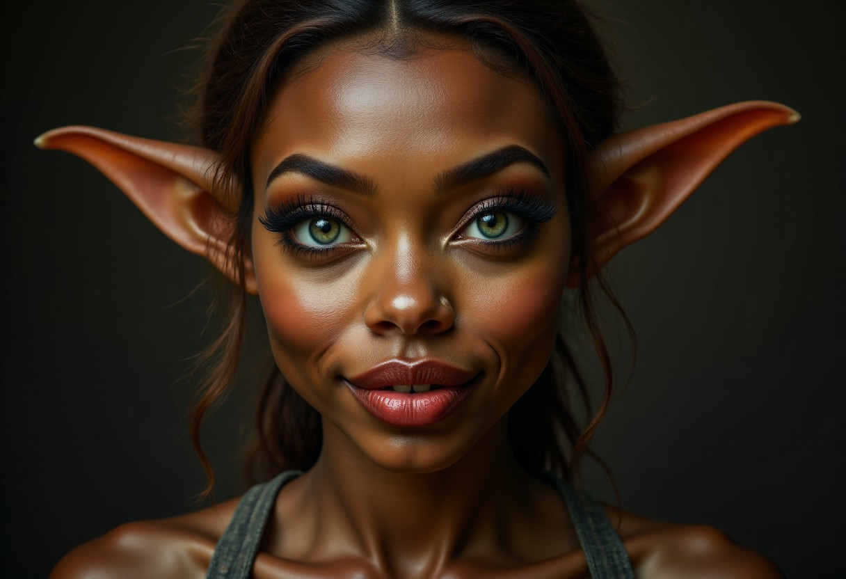 Frontal photo of very beautiful black woman, perfect blue eyes, plump red lips, beautiful makeup, black background, soft side light, high detail, masterpiece of photography,goblin woman