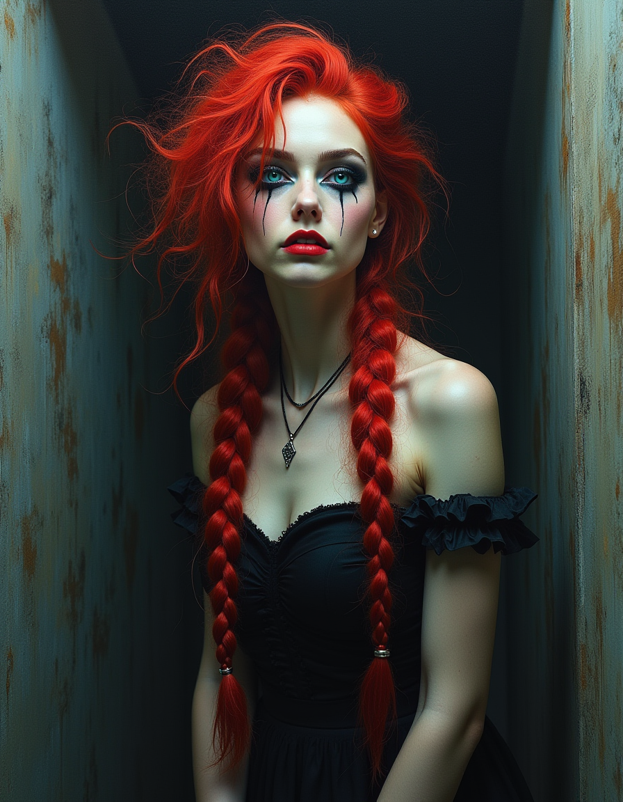 surreal photography, dreamlike imagery, subconscious exploration, bending reality, imaginative narratives, juxtaposing elements, evoking wonder and awe, transcending boundaries, challenging perceptions, fantastical landscapes, otherworldly atmospheres oil painting art style, rich colors, lush textures, expressive brushwork, blendable layers, dynamic compositions, professional-grade finish, versatile medium, timeless elegance, immersive depth, vibrant hues, intricate detailing, adds depth and dimension. dungeon prison. a yound female witch. Scarlet, messy, dutch braid hair. Pale, gothic tattooed skin and blue, wide, black-painted eyes. Irish type. Red lips. Black gothic, Bliaut with bare shoulders and bare feet. Necklace and finger rings. Black nails. Slim face and long, pointed nose. Threatening facial expressionâââ