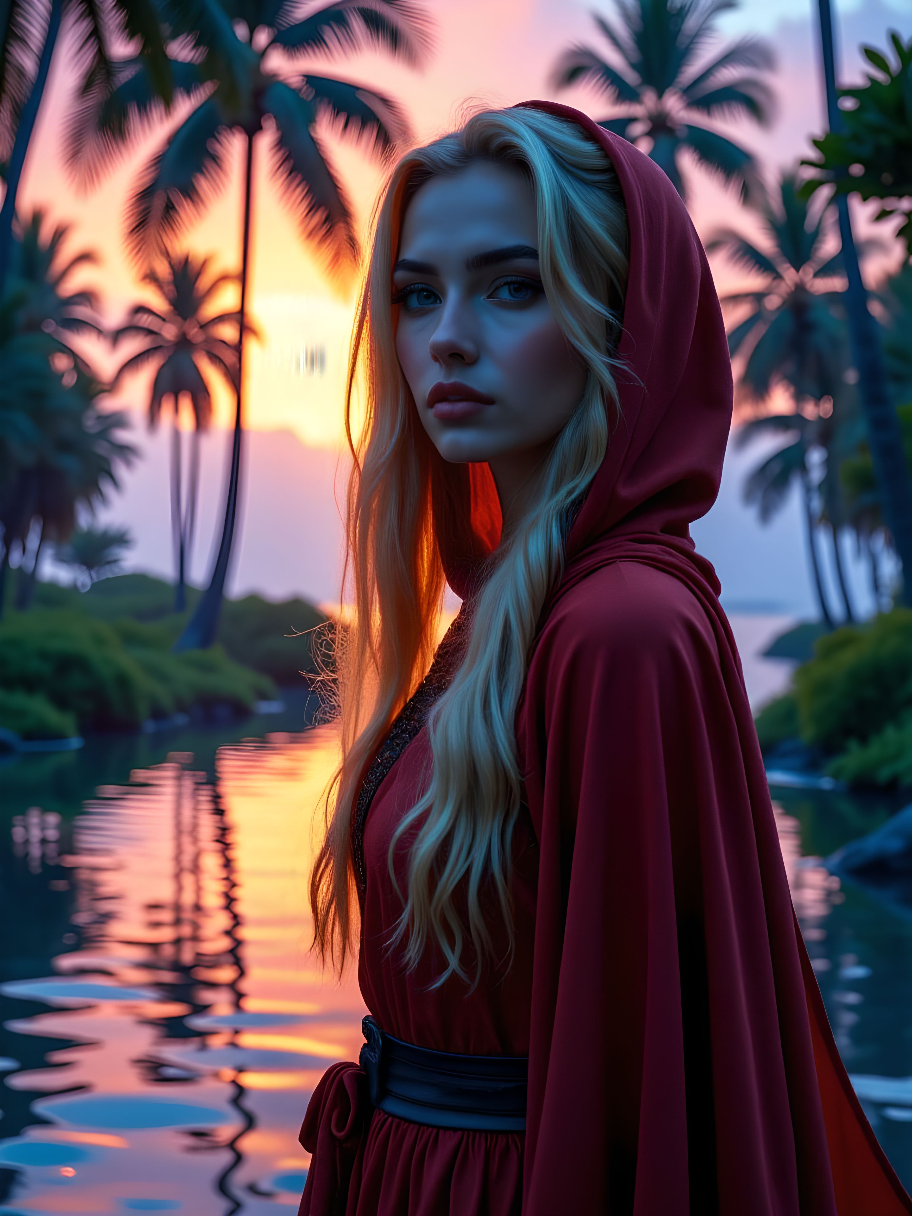 A lone woman with piercing sapphire eyes and cascading flaxen hair stands poised beside a shimmering fairy pond, its crystalline waters capturing and refracting the vibrant spectrum of a tropical sunset. The blurred greenery of an ancient, sentient forest frames the scene, where iridescent palm trees stretch skyward, their prismatic hues merging with a cosmos ablaze in celestial tones of sapphire and amethyst. The soft-focus background glows with luminescent flora, their ethereal light casting a magical ambiance, while faint whispers of enchantment stir the crystalline leaves above. Her flowing, hooded cloak, a deep fiery red, dances in the fading light like flames against the darkening expanse, its folds sweeping behind her like the wings of a majestic bird. Her fingers rest effortlessly at her sides, yet her unyielding gaze radiates an intensity that suggests the presence of a mysterious and otherworldly power, shimmering just beyond the grasp of mortal understanding. aidmaimageupgrader, aidmaMJ6.1m, detailmaximizer, mythp0rt, ne0nfant4sy, drkfnts <lora:aidmaImageUpgrader-FLUX-V0.2:0.9> <lora:aidmaMJ6.1_aidmaMJ6.1-FLUX-v0.4:0.9> <lora:aesthetic2-cdo-0.5:0.7> <lora:v1v1dr34m:0.76>