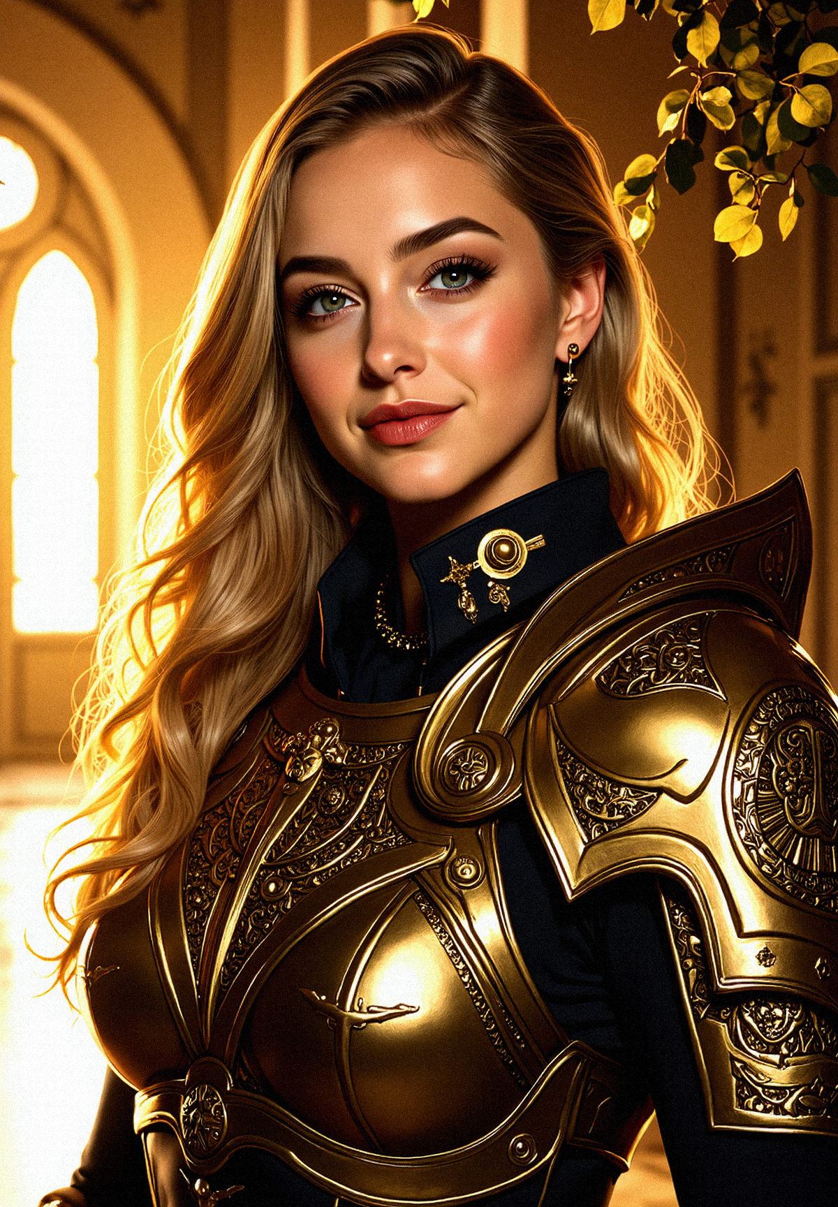 a hyper-realistic portrait of a woman wearing intricate golden and black armor, her flowing blonde hair catching the warm sunlight. Her armor features ornate engravings of celestial symbols and sharp, angular patterns, gleaming with polished gold accents against the matte black base. Her piercing blue eyes are framed by her confident smile, enhanced by her vibrant red lips. The background depicts a grand marble hall with golden light filtering through arched windows, with swirling golden leaves adding a dynamic touch to the regal atmosphere.