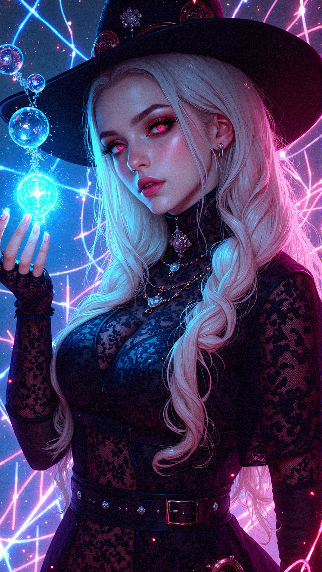 "An interdimensional sorceress with glowing, white-blonde hair and crimson eyes, casting a powerful spell. Her dark lace gloves emit shimmering lines of energy, intertwining with the surrounding abstract, multicolored lights. She wears a black, veiled hat, her expression stoic yet mesmerizing. The background consists of shifting cosmic grids, glowing neon orbs, and abstract futuristic light patterns. The scene blends mystical fantasy and high-tech aesthetics, with intricate details and vibrant contrasts." RAW photo, photorealistic, high reflection detail, intricate reflection, dynamic shadow, pink lips, intense eyeshadow, long eyelashes,