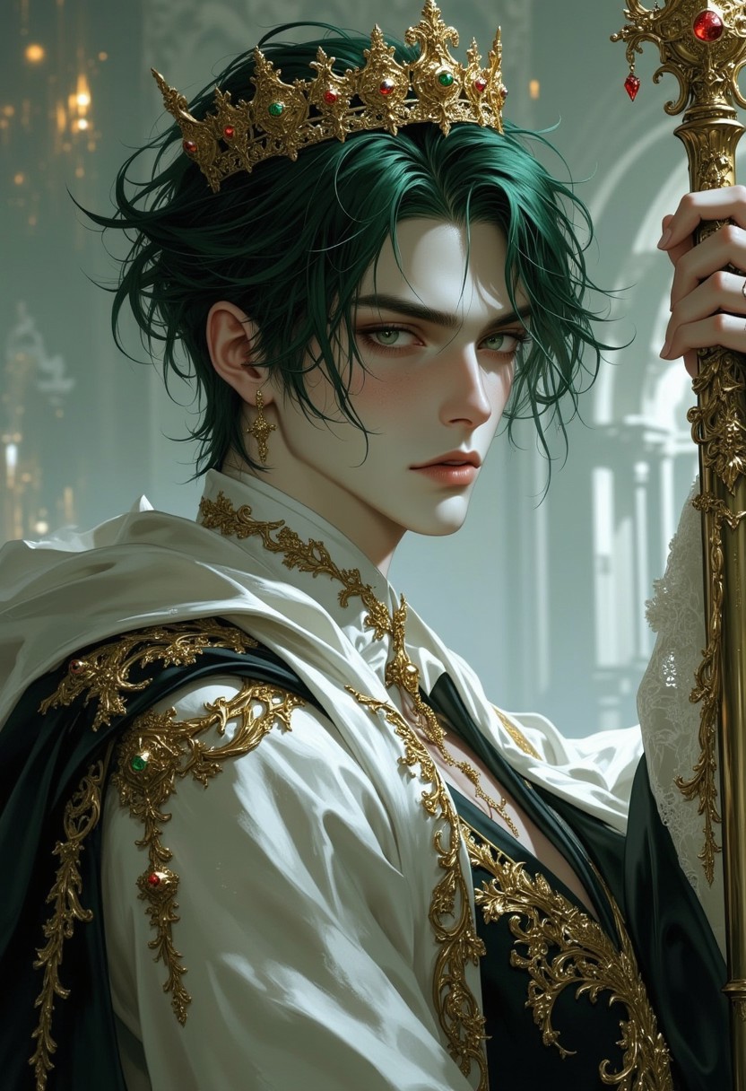 A hauntingly beautiful royal young man adorned in opulent, gothic attire. They wear a delicate, golden crown encrusted with shimmering gemstones, slightly askew on their disheveled dark green hair. The character's flowing, white garment features ornate lace cuffs and gold embroidery, exuding an air of faded nobility. The backdrop is a muted, misty atmosphere with faint golden light fractals, evoking a sense of mysticism and forgotten grandeur. The overall composition balances beauty and melancholy, portraying the tragic elegance of a fallen monarche