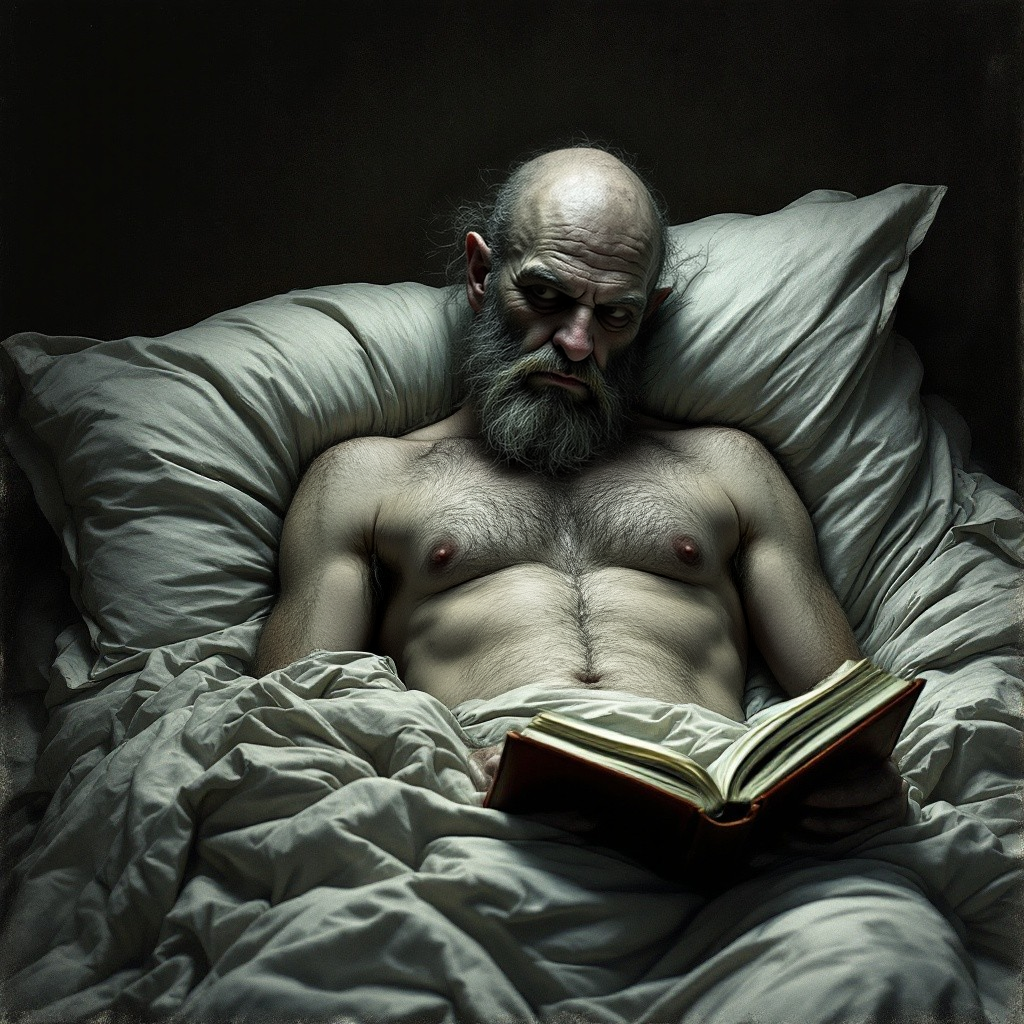 beksiÅski ebenezer scrooge portrait, hirsute, reading a book in bed, shirtless <lora:xhirsute-4.0:1>