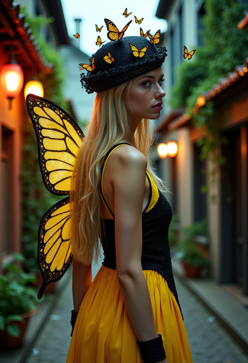 genxsoftclub01, fashion photograph, High-fashion editorial photography capturing a sleek and modern aesthetic. Subjects are posed confidently with bold, expressive body language. The environments vary between neon-lit urban streets, minimalist industrial spaces, and surreal outdoor settings. Dramatic lighting, motion blur, reflective surfaces, and selective focus are used to enhance the mood. Outfits feature a mix of glossy textures, avant-garde silhouettes, and contemporary color palettes, including deep reds, stark whites, and dark neutrals. Accessories are minimalist, and hairstyles range from sleek ponytails to tousled updos. The compositions emphasize contrast, dynamic angles, and a blend of retro and futuristic elements. featuring a graceful elven fairy with delicate features and long blonde hair. She stands elegantly in an enchanting, overgrown alleyway, wearing a striking yellow and black dress embellished with intricate lace and tiny butterflies. Atop her head, she sports a fancy, dark dome-like hat adorned with flowers and more of the same butterflies. Her butterfly-like wings shimmer with golden hues and are adorned with intricate patterns. The atmosphere is magical, as butterflies of various sizes and colors flutter around her and the surrounding buildings. The old, slightly dilapidated buildings are covered in lush greenery, and warm, glowing lanterns cast an inviting glow throughout the scene. The overall mood is conceptual, vibrant, and cinematic.