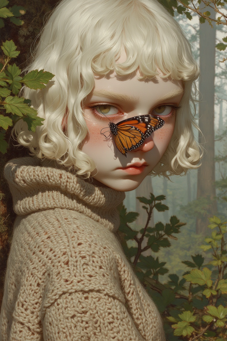 <lora:8a3a5085-db80-44fe-a910-f51f867f0265.TA_trained:1.00>((animaport)) Upper body portrait of a white woman with light freckled skin, dressed in a loose, oversized knit sweater in muted brown and cream tones. Her long, curly hair is styled in loose waves, and she gazes off to the side with a soft, introspective expression. A vibrant yellow monarch butterfly perches on her cheek, drawing attention to the contrast between her natural warmth and the vivid insect. The background is a serene forest scene, where the soft green foliage blends into misty fog, creating a calm, almost ethereal setting. The camera angle is slightly above, capturing her profile and the butterfly resting on her face.
