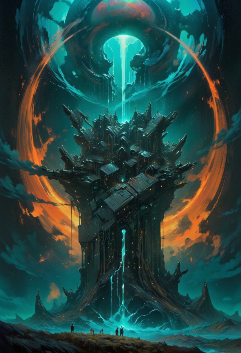 This is a digital artwork depicting a giant supermassive endless geometrical tower, set against a dramatic, scifi backdrop. The tower is constructed with a metal plates and small glowing windows. The structure is illuminated by a few bright dramatic, yellow lights, casting a neon glow. The background is a swirling, chaotic mix of electric cyan and deep oranges, with a large, glowing red orb or vortex on the background of the image. The swirling colors create a sense of movement and chaos, suggesting a stormy or futuristic atmosphere. The ground beneath the tower is a dark alienscape, with a few small, shadowy silhouettes, adding to the sense of isolation and desolation. The overall mood of the artwork is mysterious and mesmerizing, with a sense of unknown or exploration. The texture of the artwork is highly detailed and realistic, with a focus on the appearance of the tower, enhancing the sense of scifi and domination. The image conveys a sense of adventure and awe-inspiration.night sky,scifi,Neo-Brutalism,Futurism, colorful, vibrant colors,color contrast,light particles, high saturation,deep rich colors,vivid colors,shimmer,dramatic,centered,depth of field,directional lighting,godrays,dense fog,visionary,beoynd-reality, suspenseful,scenery,forced perspective,epic scale,(close-up:1.6), John Harris Moebius Graham Vivian Sutherland Syd Mead Roger Dean