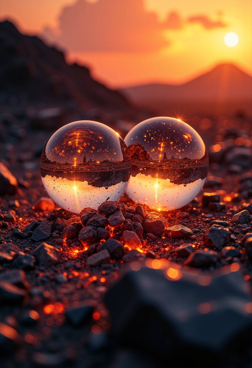 Two giant intertwined pure glass sphere stand in a active volcano in Africa. Extra macro close-up shot of a eruption scenery inside. Nice bokeh and tilt-shift. Surreal warm vivid light from summer noon. Cinematic light.