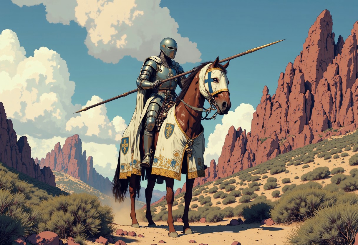 in the style of cksc, a realistic Portuguese knight in jousting armor, mouting a big Lusitano breed horse, the knight wears a full-plate tournament armor, the helmet has it's visor up, the knight holds a long cavalry lance and white blue-crossed shield. The horse is wearing a chaimail cladding down to it's knees, draped with a white barding cloth adorned with the Shield of the Kingdom of Portugal coat-of-arms. The background is a rocky mid-moutainous landscape of northern Portugal with maquis brushlands.