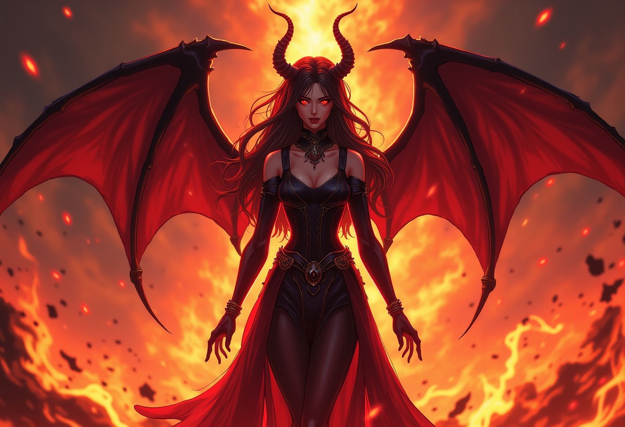 A digital anime artwork in the style of cklg, inksketch, a demon Woman from hell, she rises from ethereal flames