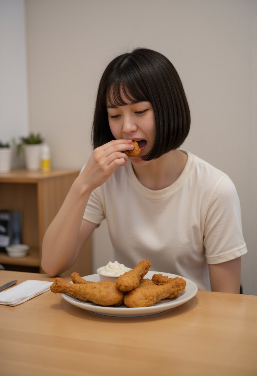 Cute asian girl with bobcut,eating fried chicken, FictionalAyumi
